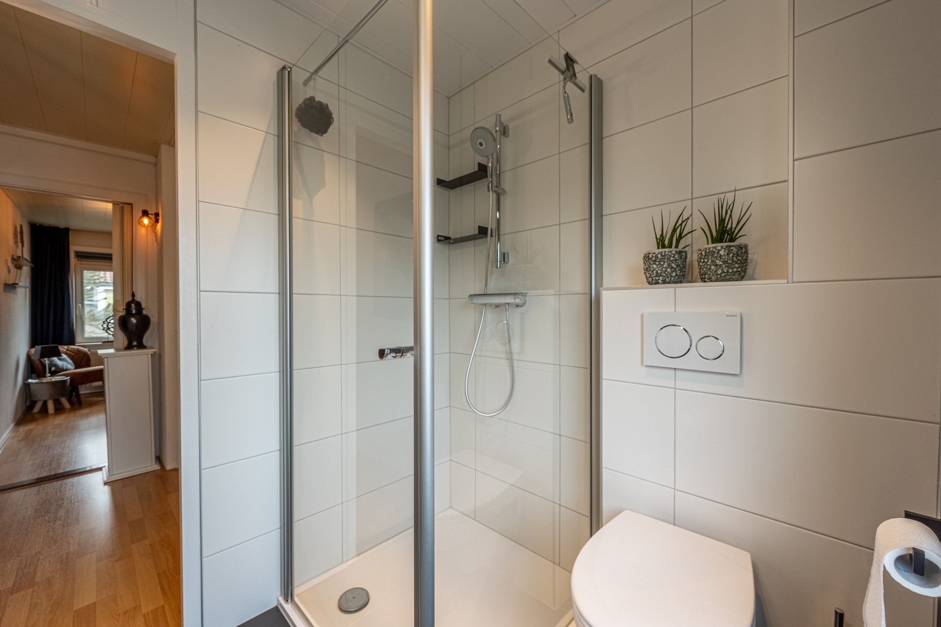 De badkamer is gerenoveerd in 2021 en netjes ingericht en voorzien van een douche, wastafel en toilet. Een fijne ruimte waar je de dag fris begint en ontspannen afsluit.