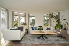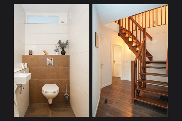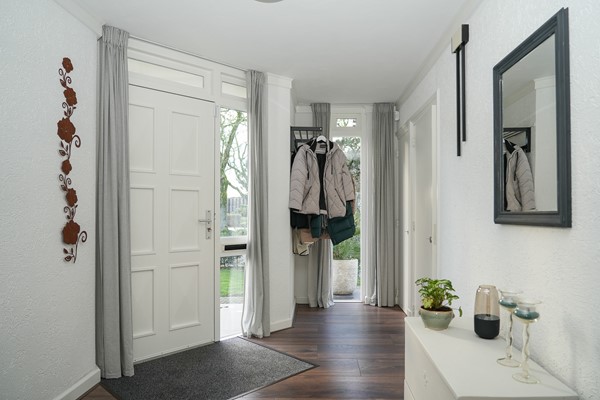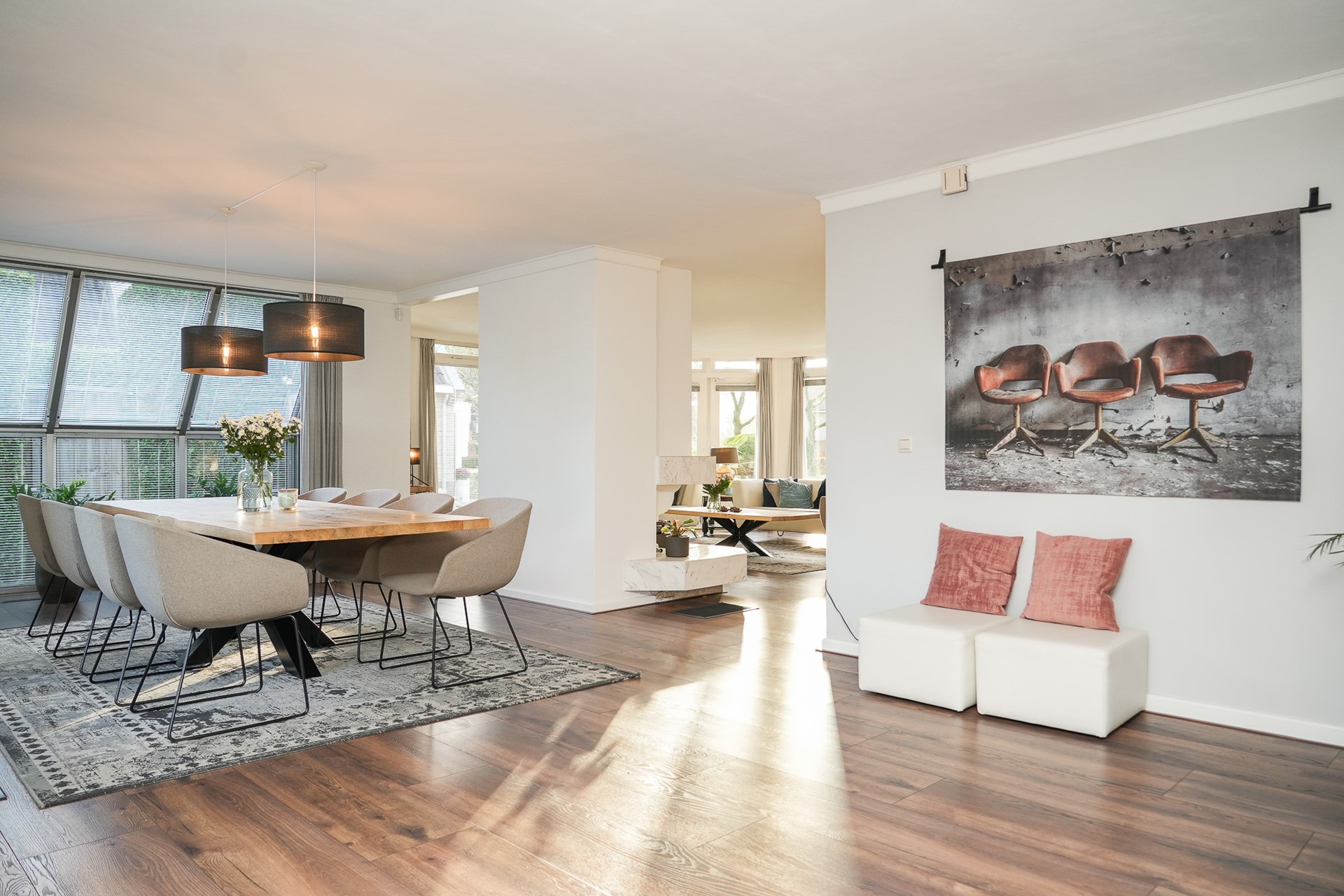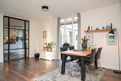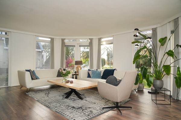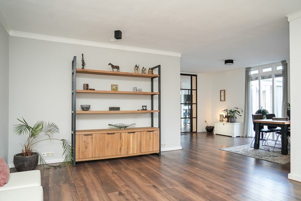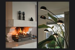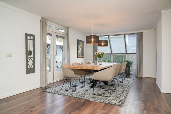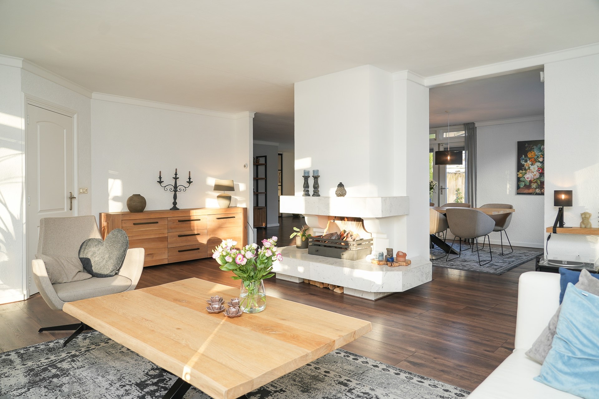 Je komt binnen in de hal met meterkast, toiletruimte en trapopgang. Vanuit hier loop je door naar de royale woonkamer met sfeervolle gashaard, grote raampartijen rondom en zicht op de tuin. De ruimte biedt plaats aan zowel een royale zithoek als een aparte eethoek.