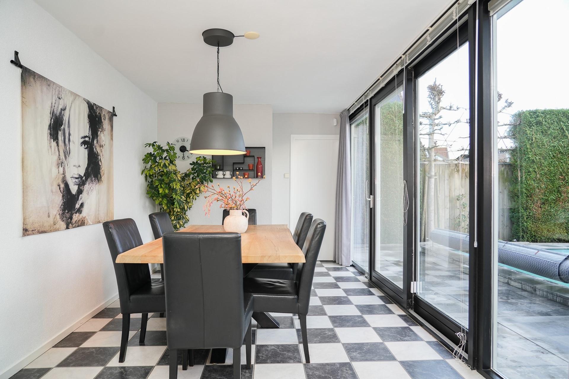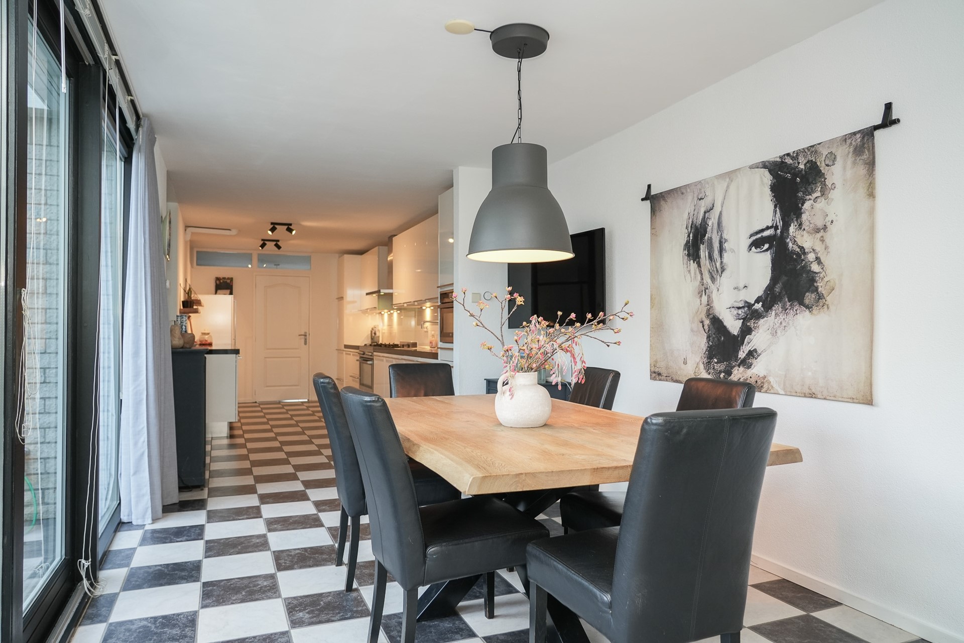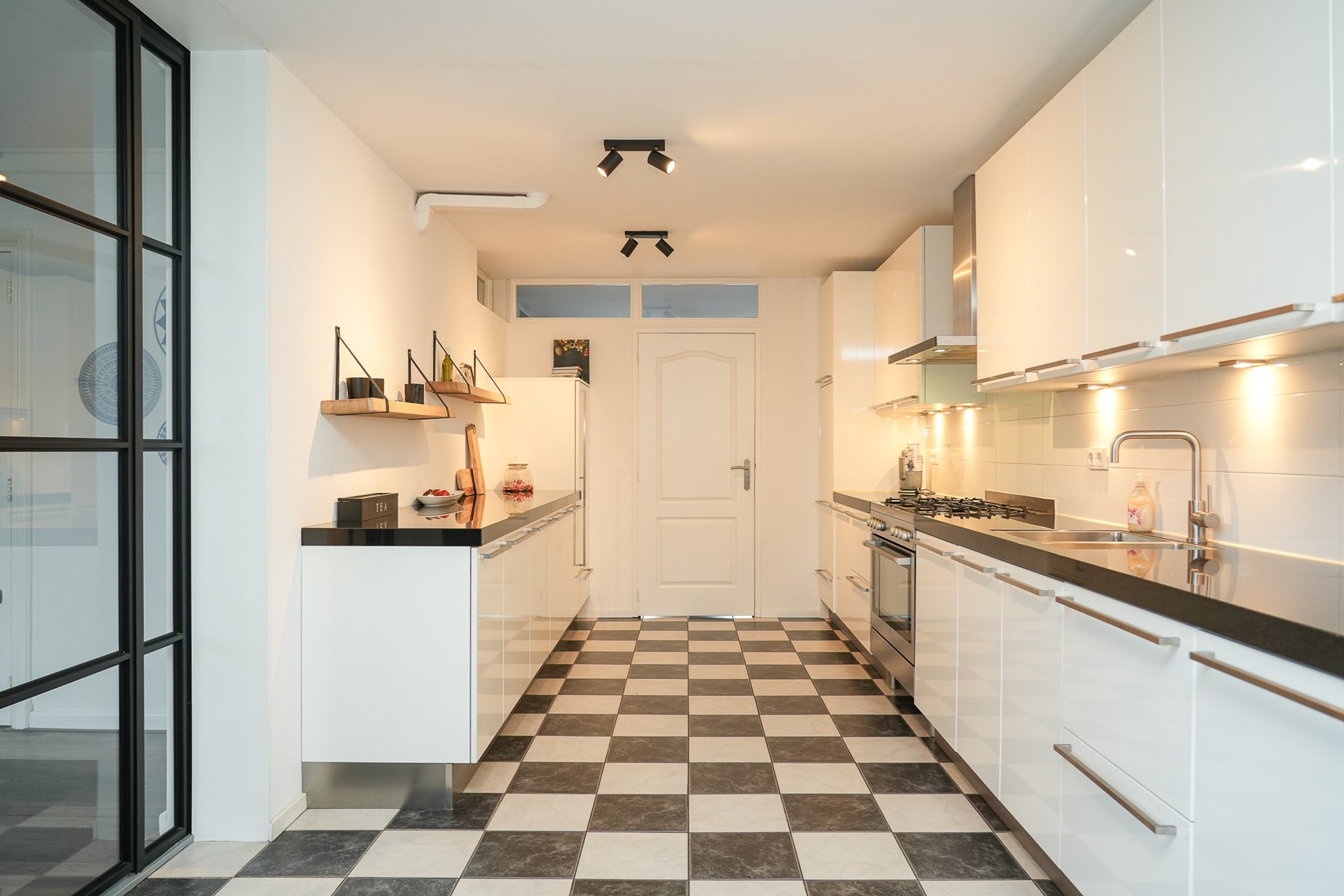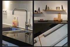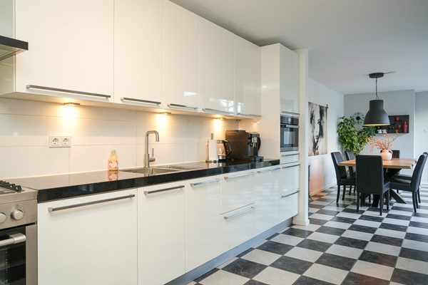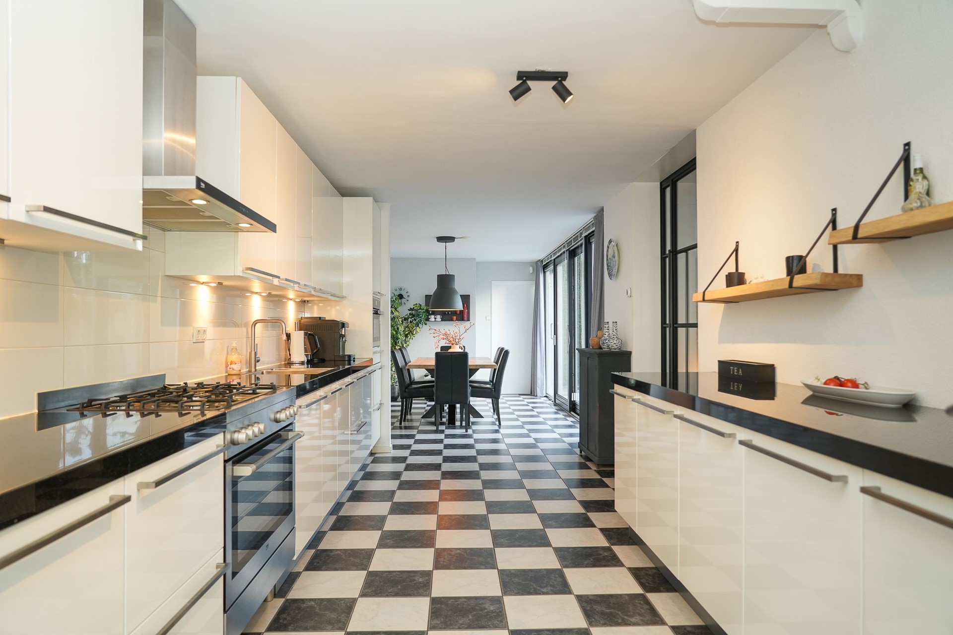 Aansluitend vind je de ruime woonkeuken met zwarte composiet werkbladen, een klassieke zwart-witte tegelvloer en dubbele keukenopstelling. De keuken is van alle gemakken voorzien: een 5-pits gaskookplaat, brede oven, koelkast, vriezer, vaatwasser, combi magnetron en veel bergruimte. Aan de tuinkant is een ruime eethoek met grote schuifpui naar het terras.