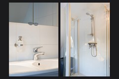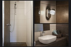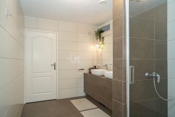 Vanuit de garage is er een deur naar de hal, waar het toilet en aansluitend de badkamer bereikbaar is. De badkamer biedt een douche, 2 wastafels en is ook toegankelijk vanuit de eetkamer.
