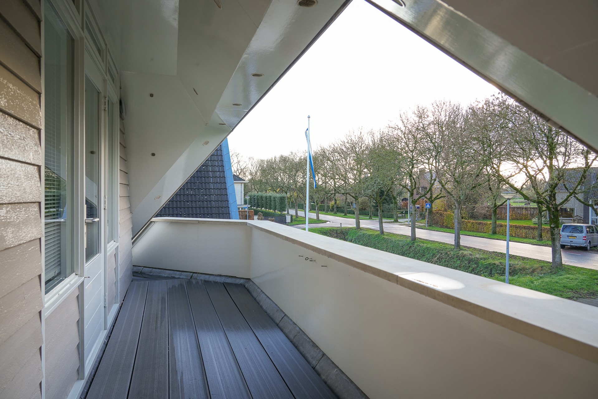 Het balkon ligt aan de voorzijde van de woning en is vanuit twee slaapkamers toegankelijk.