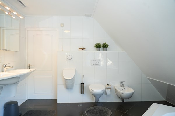 De badkamer is modern en licht en beschikt over een ligbad, een aparte douchecabine, een wastafelmeubel met dubbele wastafel, een bidet, urinoir en een toilet.