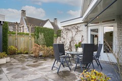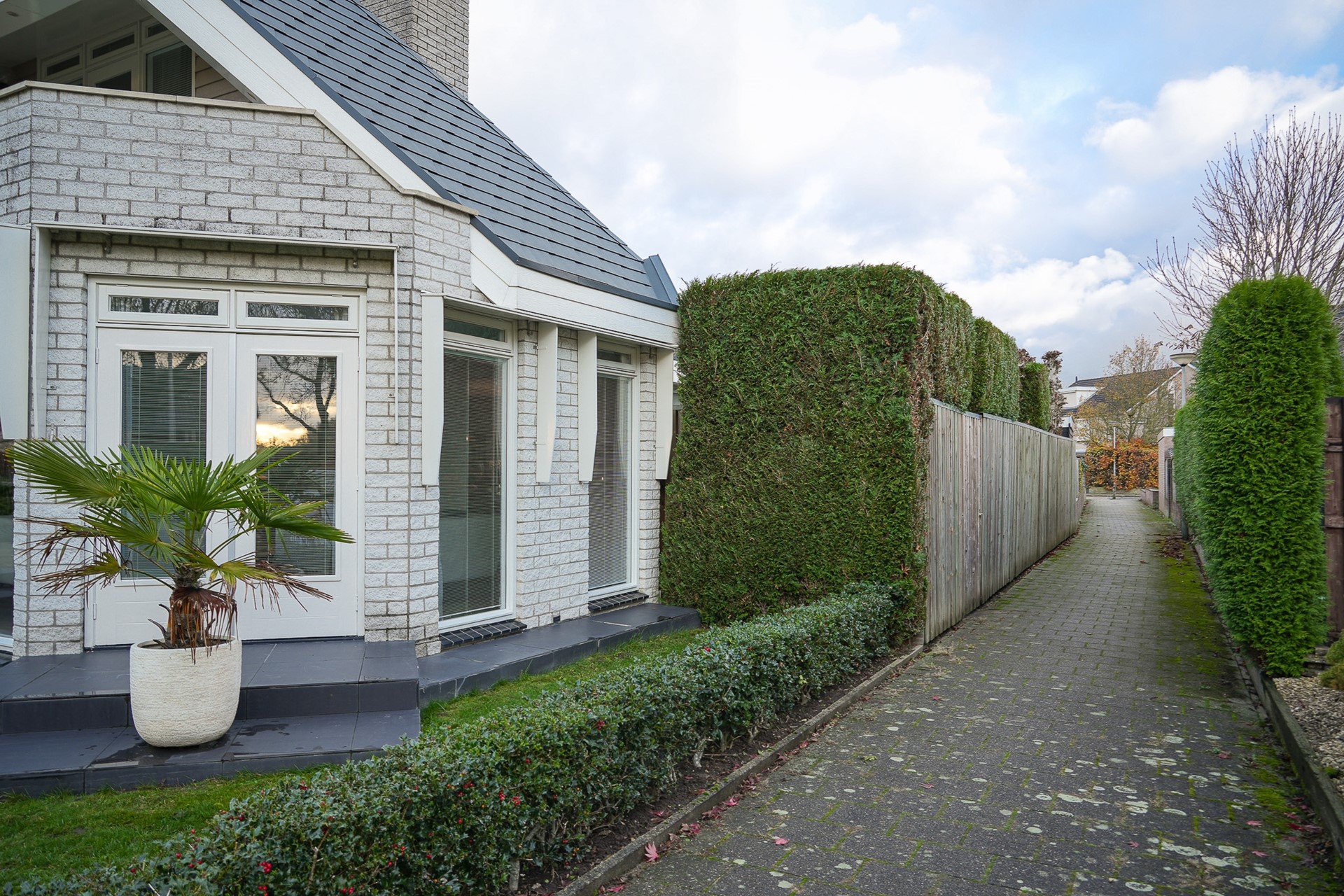 De tuin is strak aangelegd met meerdere terrassen, sierbestrating, borders en een groenblijvende haag rondom, waardoor je veel privacy ervaart.