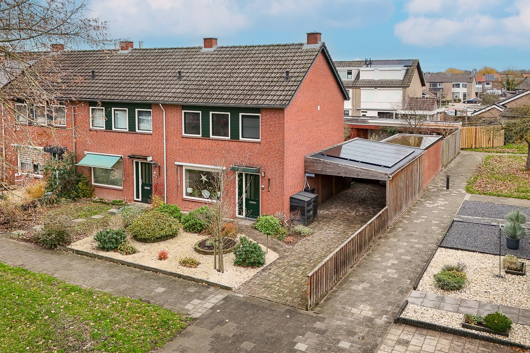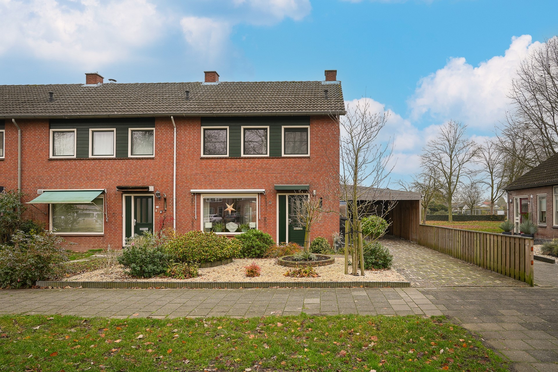 Aangebouwd aan de woning ligt de grote carport uit 2023, die volledig vernieuwd is. Aansluitend vind je de garage en een extra berging, ideaal als tuinberging of houthok.