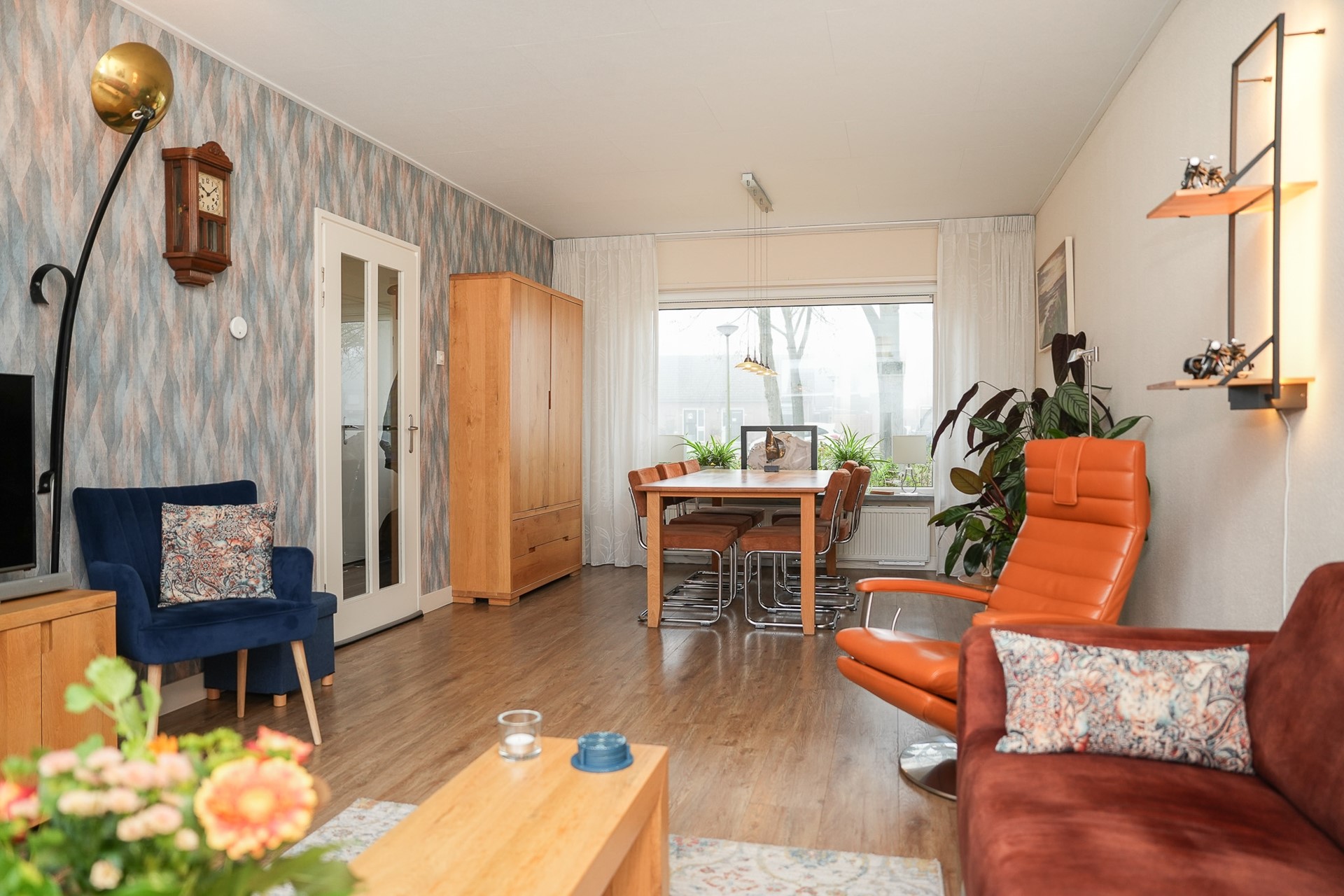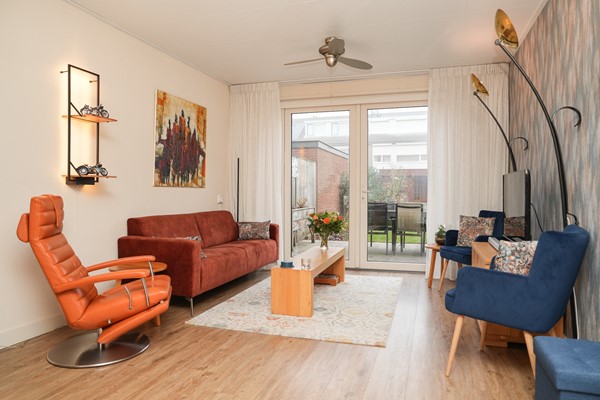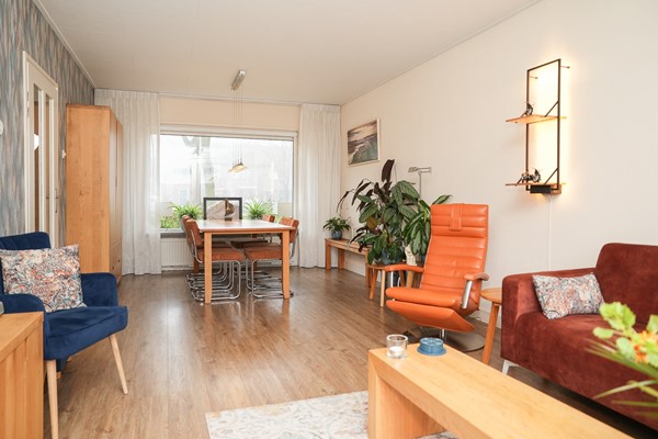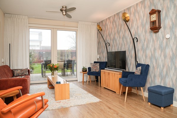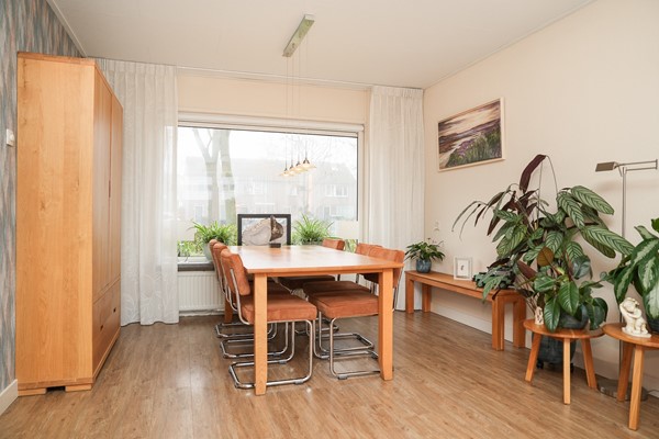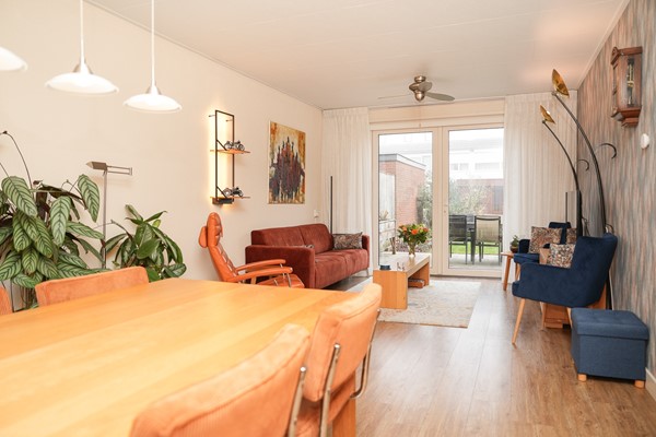 Loop je door naar de woonkamer, dan valt meteen de breedte van de ruimte op. Dankzij de dubbele deuren naar de tuin en de verbinding met het eetgedeelte voelt het leefgedeelte heerlijk open. De eettafel staat aan de voorzijde en vormt een fijne plek voor lange avonden aan tafel, met zicht op groen. De woonkamer zelf heeft een prettige lichtinval en een warme uitstraling, waardoor je er graag neerstrijkt na een drukke dag. Door de openslaande deuren is er een prachtig zicht over de diepe tuin.