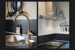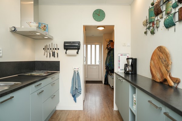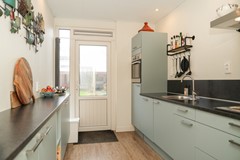 De keuken aan de achterzijde is licht en praktisch ingedeeld. Met een opstelling aan beide zijdes, vernieuwd in 2018, en voorzien van o.a. inbouwapparatuur, goede werkruimte en een doorkijk naar zowel de hal als de ruime tuin, die via een deur bereikbaar is