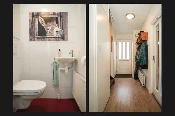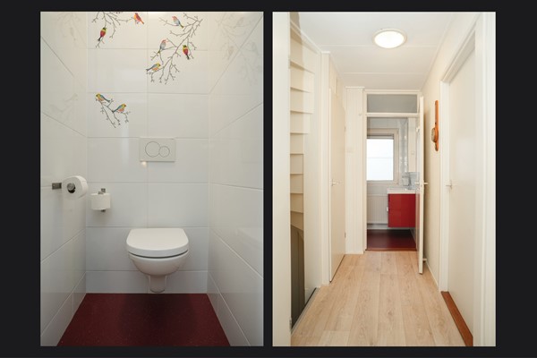Via de verzorgde voortuin kom je binnen in de hal. Hier vind je het moderne toilet, de meterkast (vernieuwd in 2015) en de trapopgang. In de kast onder de trap is ruimte voor de wasmachine-opstelling.