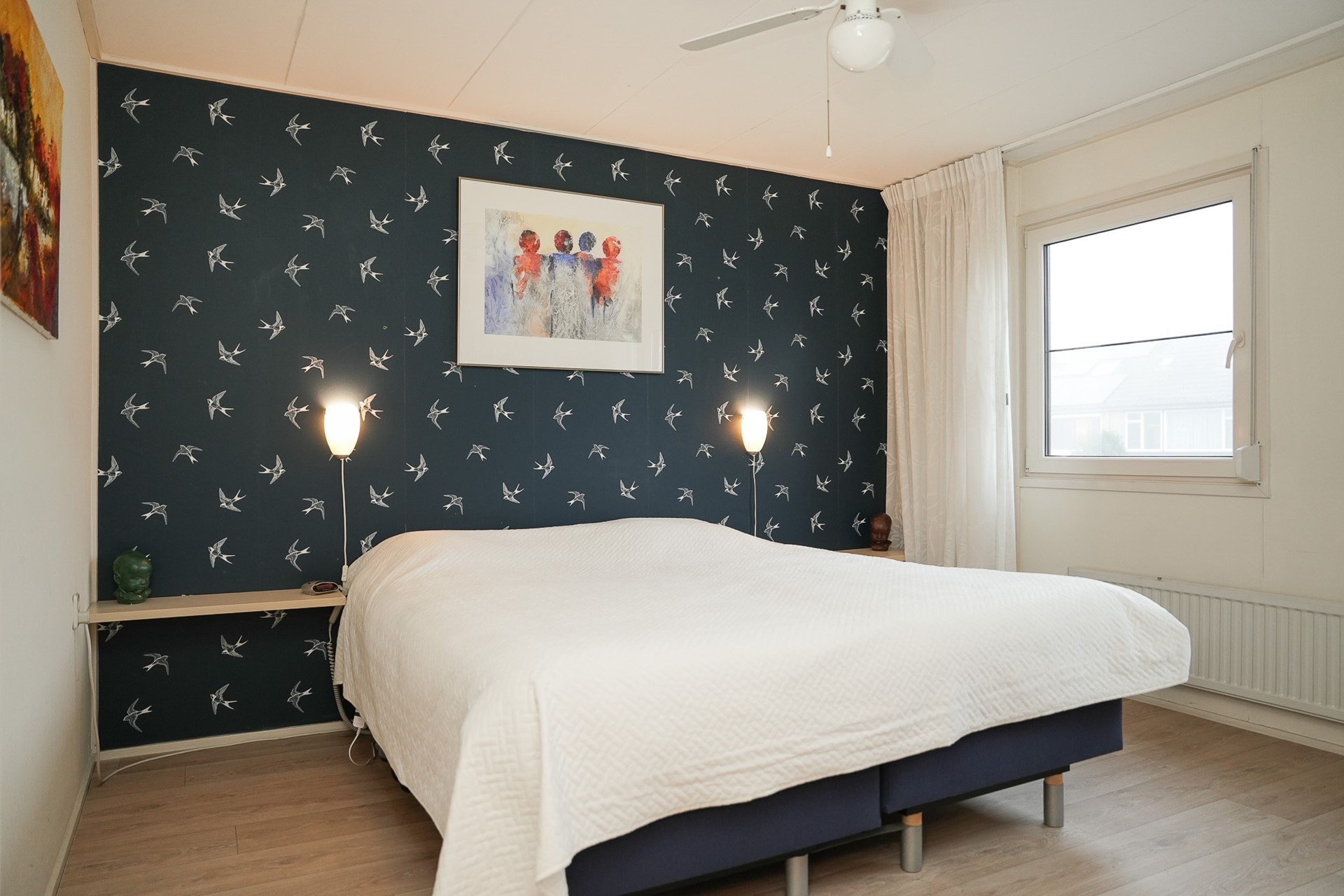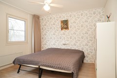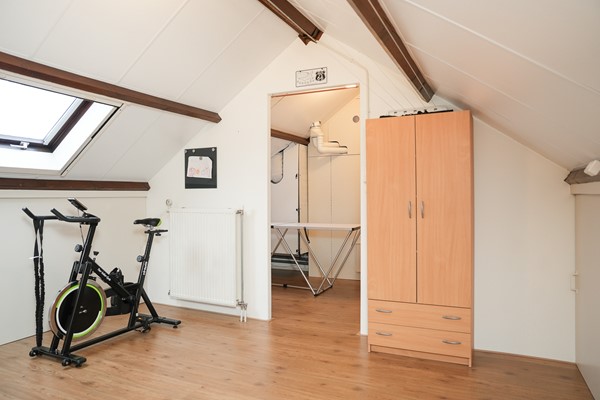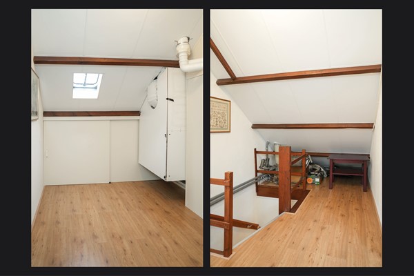 De vaste trap brengt je naar de verrassend ruime zolderverdieping. Hier is een vierde slaapkamer gerealiseerd, met een goede nokhoogte en twee dakramen die zorgen voor licht en lucht. De overloop biedt extra bergruimte onder de schuine kanten.