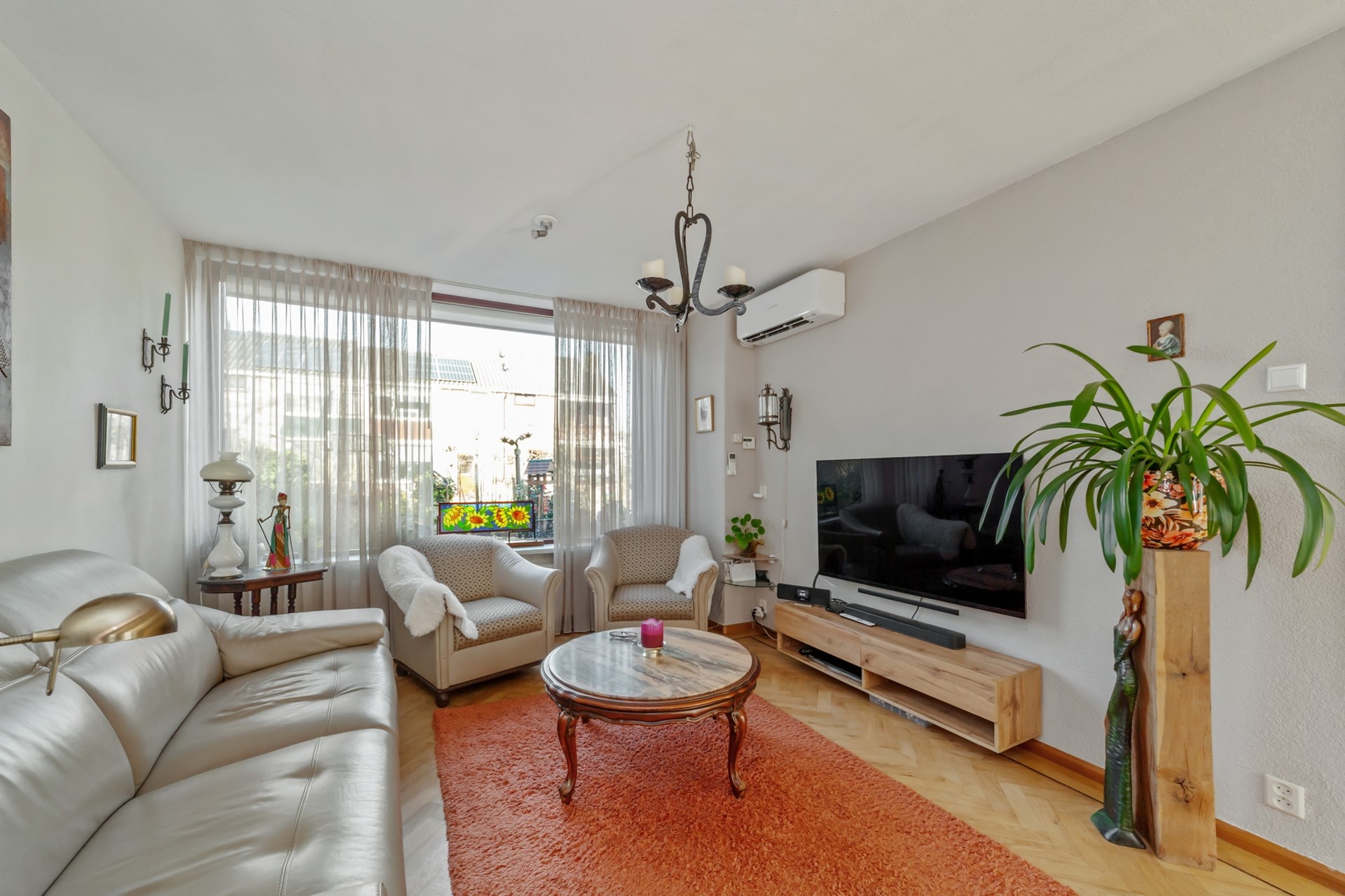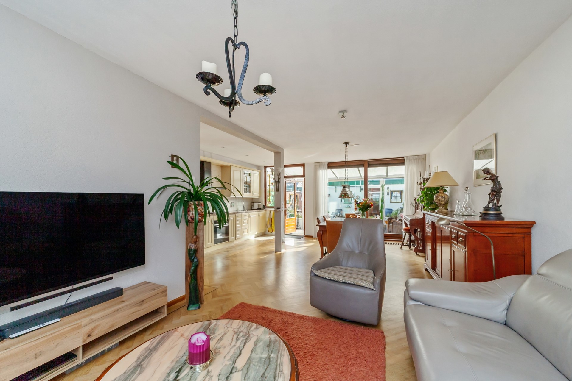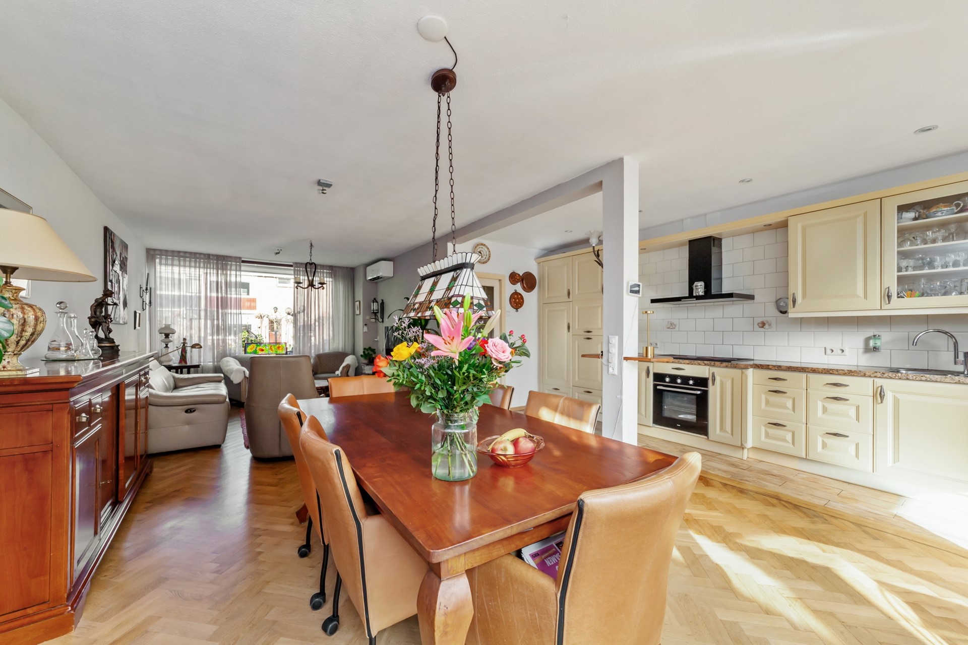 Vanuit de hal kom je in de ruime en lichte doorzonwoonkamer met aangebouwde serre. De vloer van de woonkamer is geïsoleerd (voorzijde houten vloer, serre op beton) en afgewerkt met een fraaie parketvloer. Daarnaast is de woonkamer voorzien van airconditioning, wat zorgt voor extra comfort.