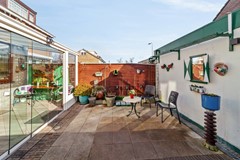 De later aangebouwde serre is bereikbaar via een schuifpui en zorgt voor veel extra licht in de woonkamer. Hier ligt een tegelvloer en heb je een mooie verbinding met de tuin.