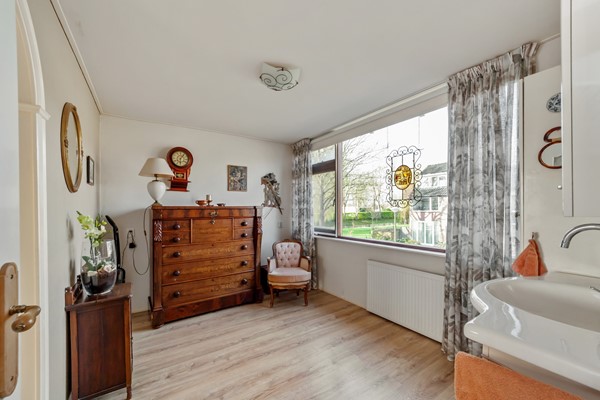 You reach the entrance to the house via the spacious front garden. The hall contains the toilet and a practical cupboard with space for the washing machine and dryer. From the hallway, you enter the spacious and bright living room with an attached conservatory. The living room floor is insulated (wooden floor at the front, concrete in the conservatory) and finished with beautiful parquet flooring. Additionally, the living room is equipped with air conditioning, ensuring extra comfort.