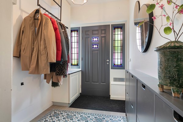 De hal is een ware eyecatcher, waar de nieuwe maar karakteristieke tegels op de vloer direct de aandacht trekken en zorgen voor een perfecte balans tussen authentiek en modern.