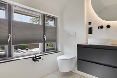 De toiletruimte - eveneens toegankelijk vanuit de hal - is ingericht met een zwevend toilet en een fonteintje. Dit kleinste kamertje heeft een modern design en een hoogwaardige afwerking.