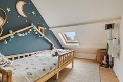 De slaapkamer aan de voorkant van het huis biedt een heerlijke plek om weg te dromen, met voldoende ruimte voor een kast of bureautje. De trap naar de slaapzolder voegt een uniek element toe aan deze kamer, waardoor het een veelzijdige ruimte is die aan verschillende behoeften kan voldoen.