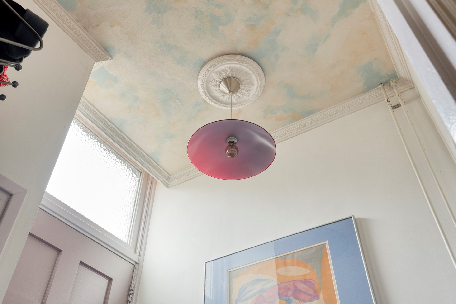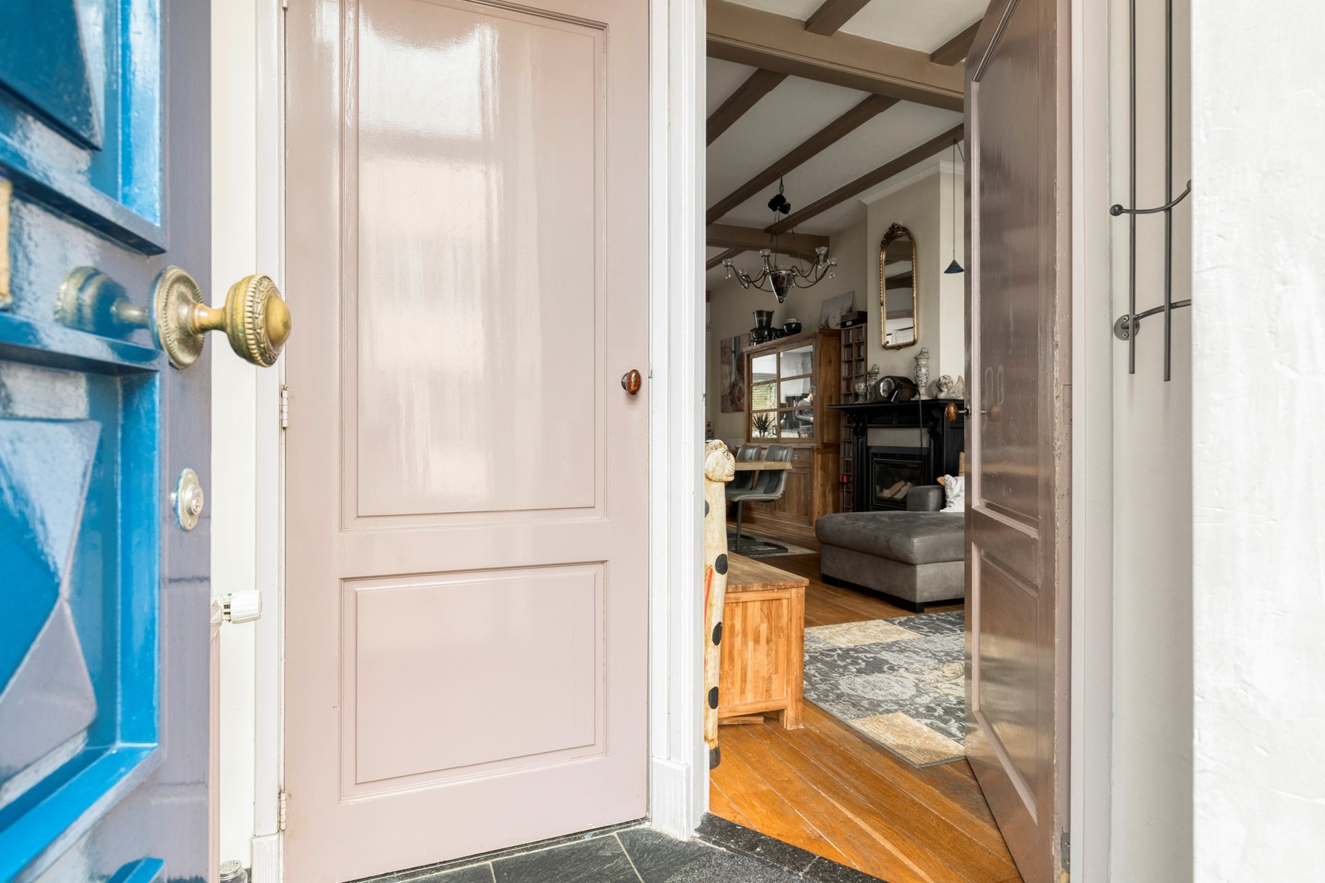 Keurige entree van de woning. Deze hal geeft toegang tot een royale berging waar de fietsen in kunnen worden geplaatst. Wel zo handig. Leuk item is het beschilderde plafond die direct het sfeertje van de woning laat voelen. De hal geeft ook toegang tot de woonkamer en meterkast.