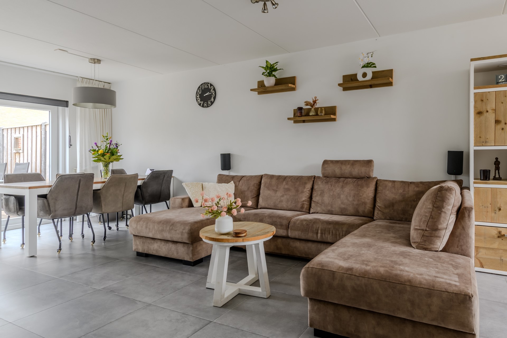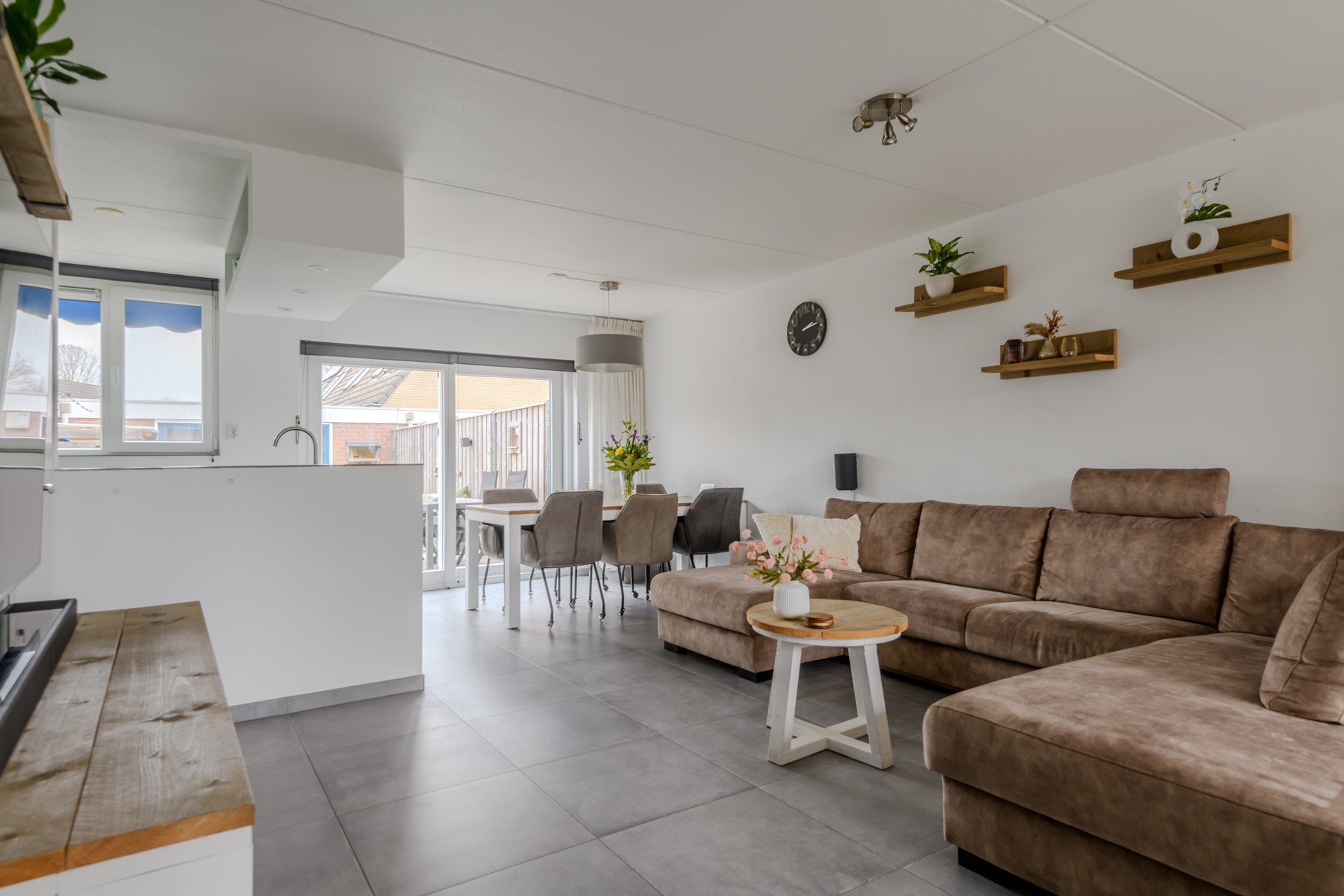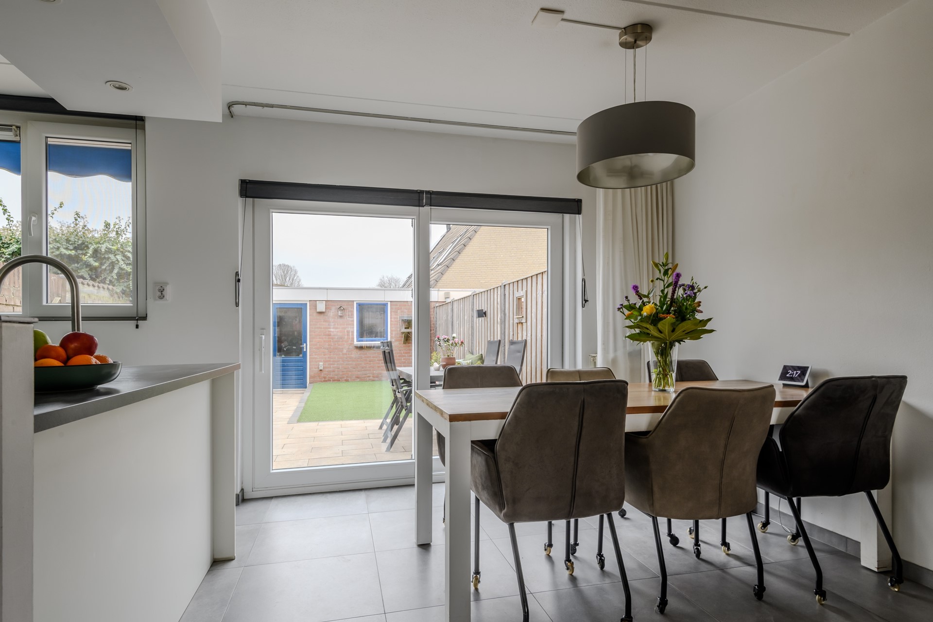 De kunststof schuifpui aan de achterzijde biedt toegang tot de onderhoudsvriendelijke achtertuin op het zonnige zuidoosten.
