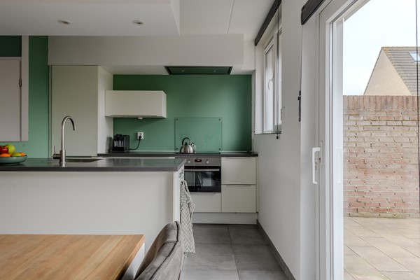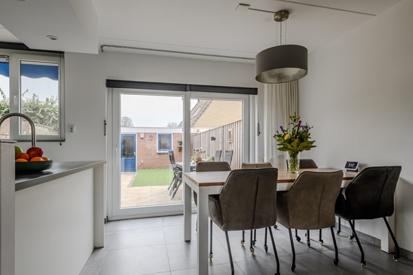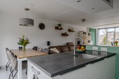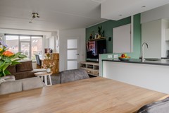 De lichte woonkamer met vloerverwarming biedt ruimte voor een fijne zithoek en een gezellige eethoek direct bij de open keuken. De keuken is in 2017 vernieuwd en vormt een gezellige centrale plek in de woning, van waaruit je de gehele woonkamer kunt overzien. Deze keuken is van alle gemakken voorzien: