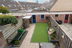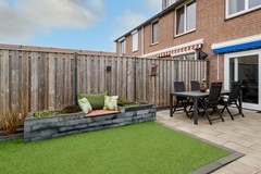 De tuin ziet er zomer en winter heel netjes uit! Een zeer royaal terras met zonnescherm waar je met velen kunt zitten, strakke borders en moderne schuttingen aan beide zijden. Hier heb je nauwelijks onderhoud aan. Een uitgebouwde stenen berging met achter uitgang zorgt ten slotte voor veel bergruimte voor de fietsen en de tuinspullen.
