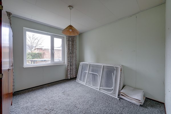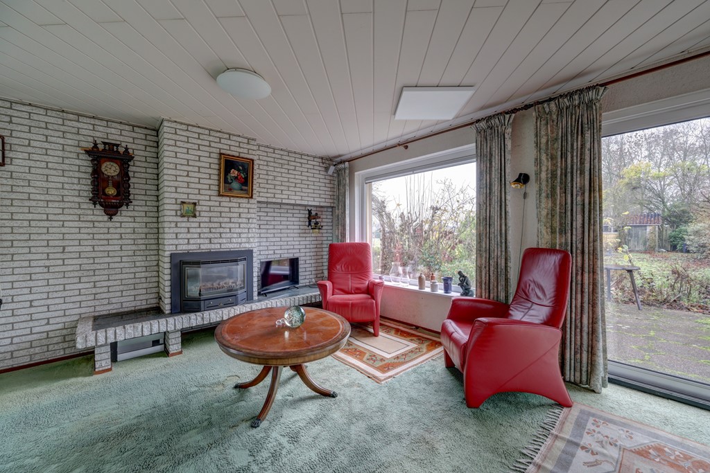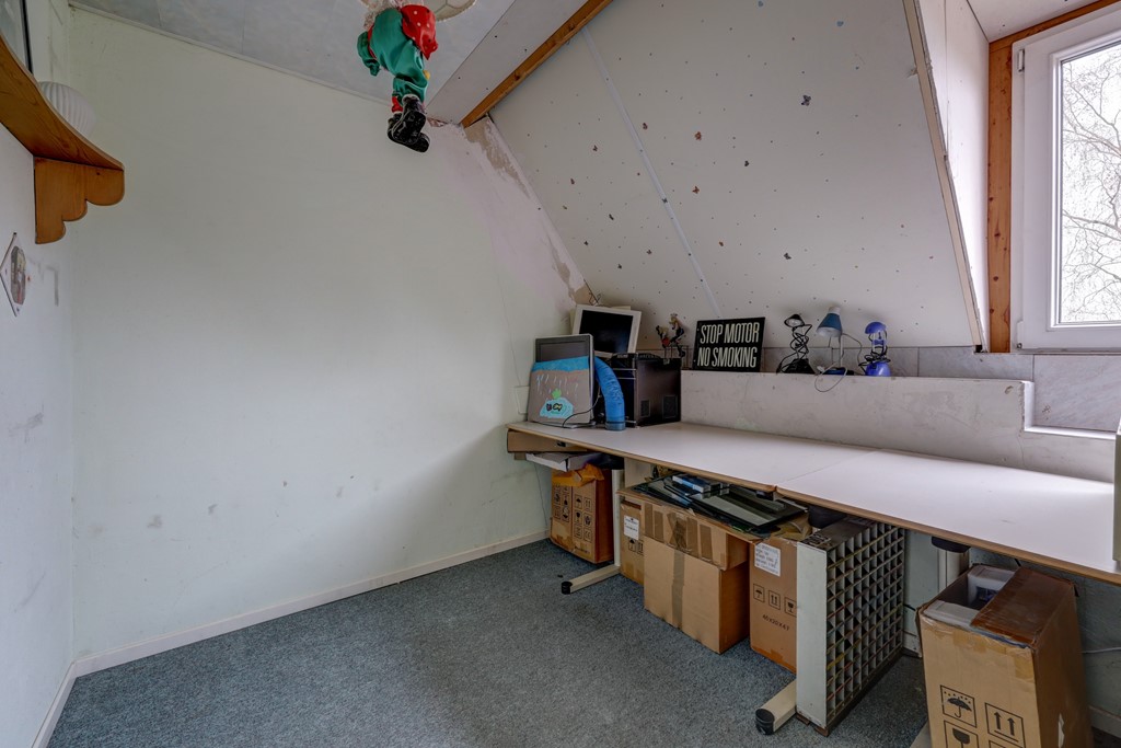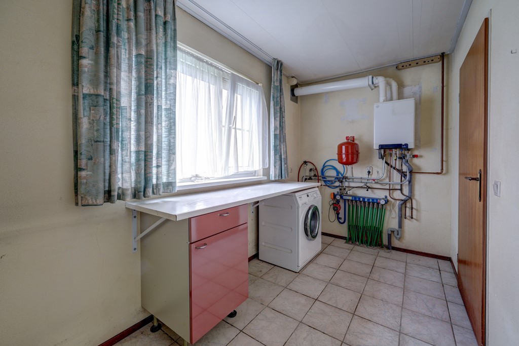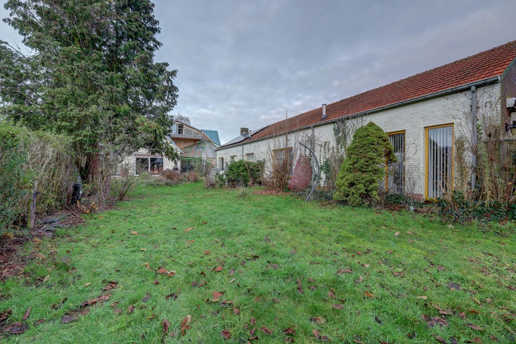 Layout: Hallway, toilet, bathroom, spacious L-shaped room with a fireplace and French doors to the garden, three bedrooms, and a laundry room. Includes a very spacious attic storage space running the entire length. (Note: According to the zoning plan, the outbuilding is not permitted for residential use.)