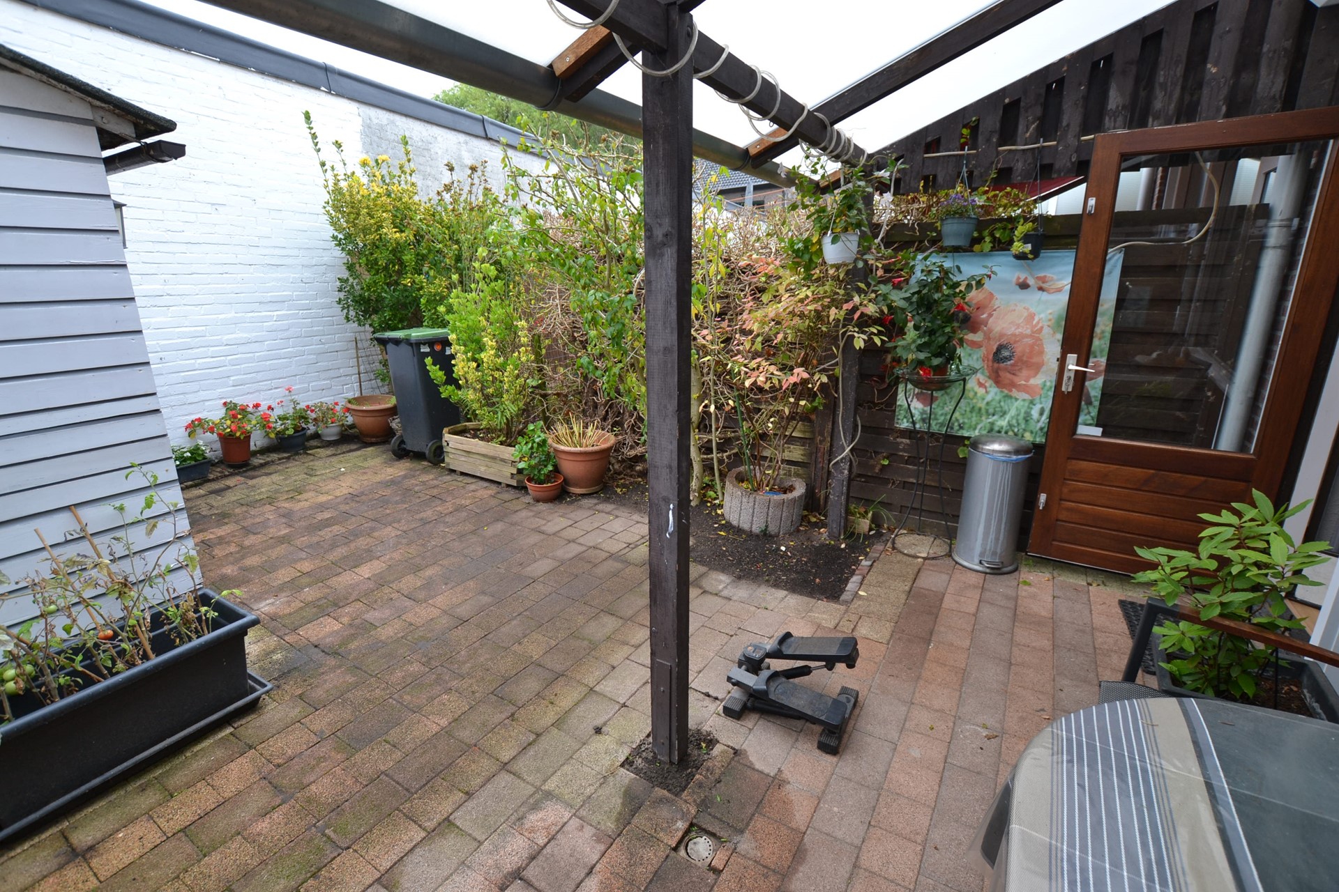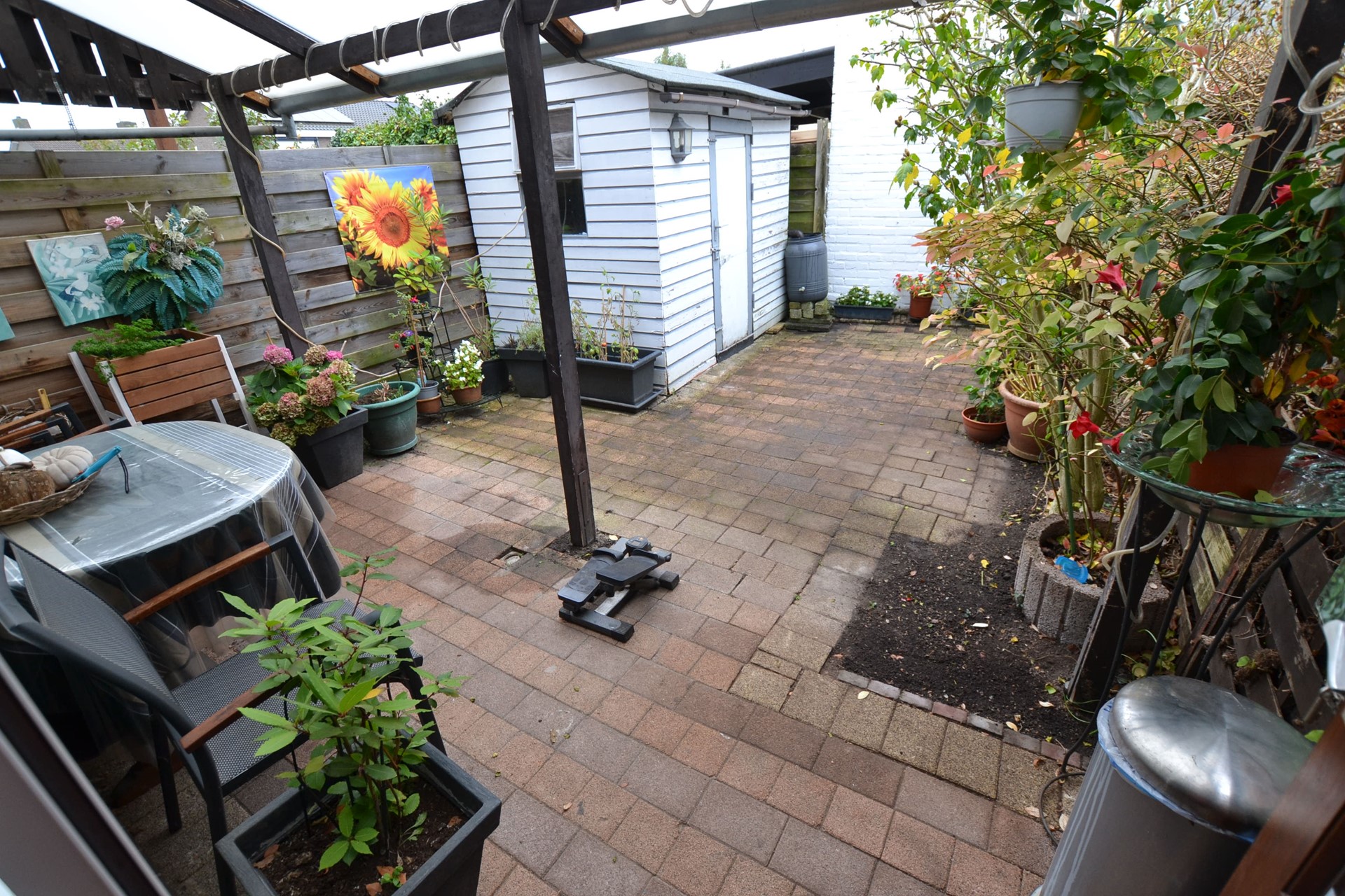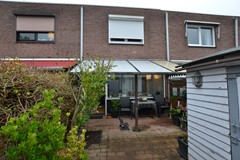 Achtertuin is grotendeels bestraat en voorzien van een overkapping 4,70 x 2,30, houten tuinhuisje 2,30 x 1,60 met elektriciteit, houten schuttingen en beplanting.