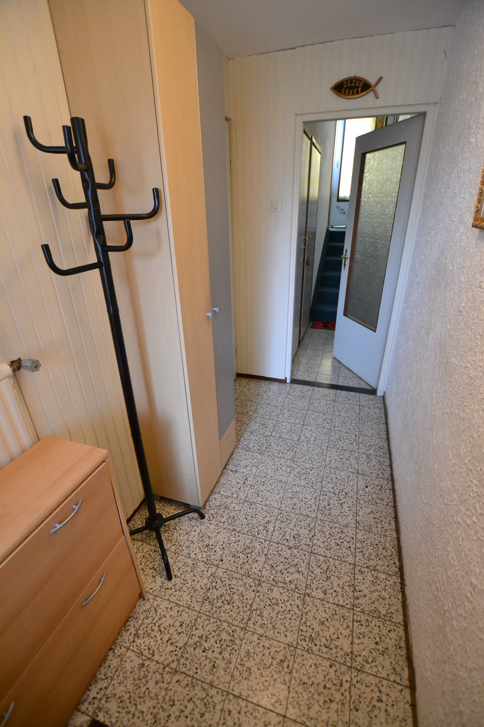 Entree/hal 3,05 x 1,35 met plavuizenvloer, deur naar gang en garage.
