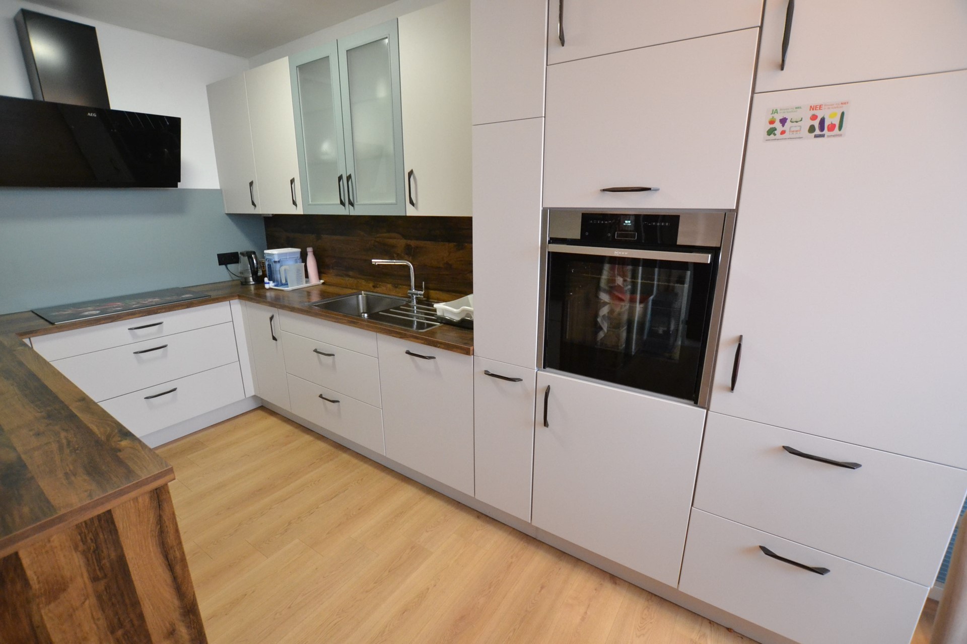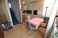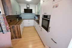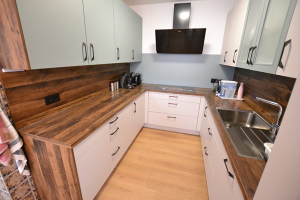 Keuken 5,35 x 4,35/2,25 met laminaatvloer, deur met hordeur naar achtertuin en nieuwe aanbouwkeuken (december 2022) met inductie kookplaat met moderne afzuigunit, vaatwasser, heteluchtoven, apothekerskast, koelkast, draaideurcarrousel en spoelbak.