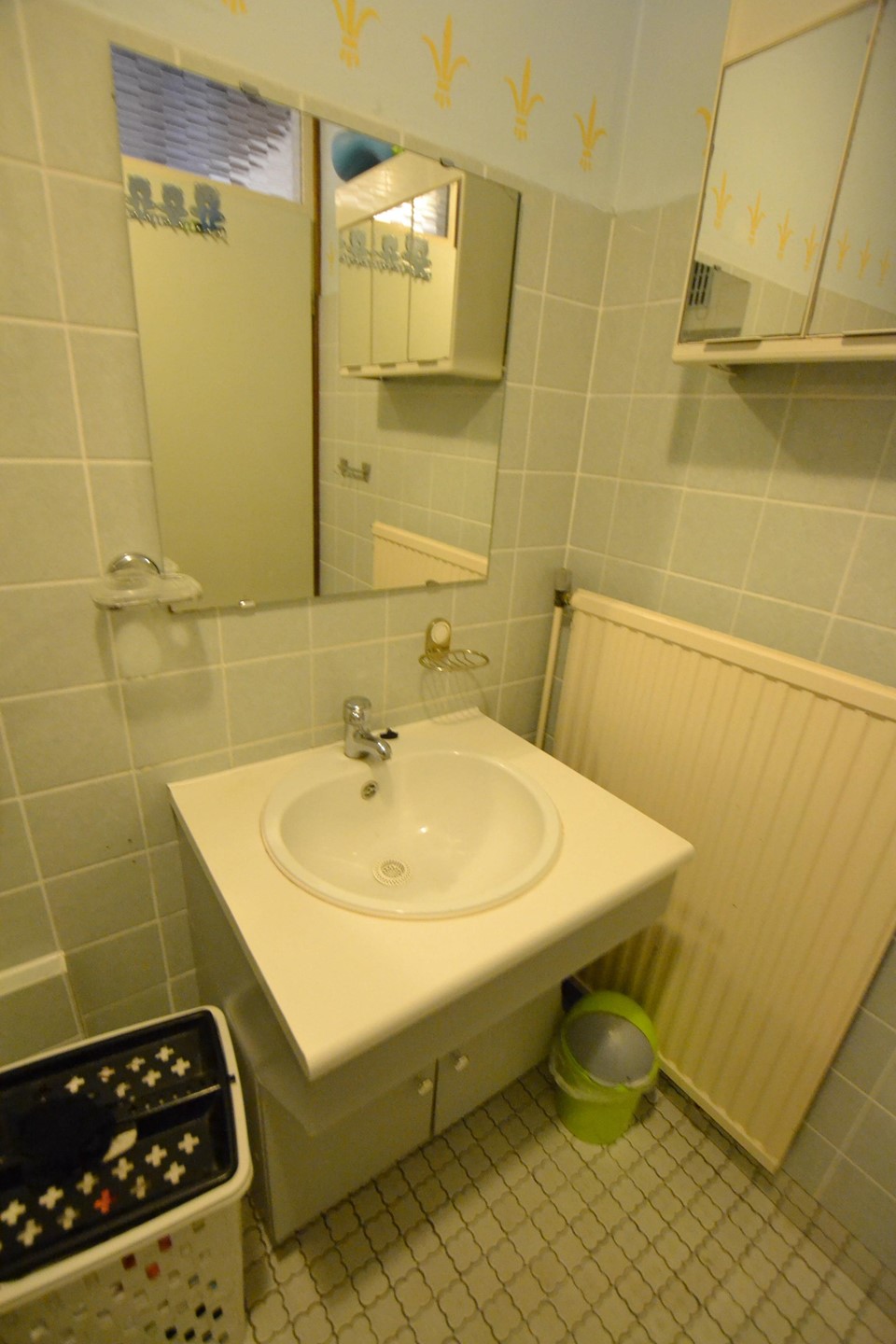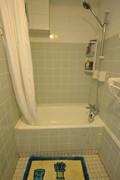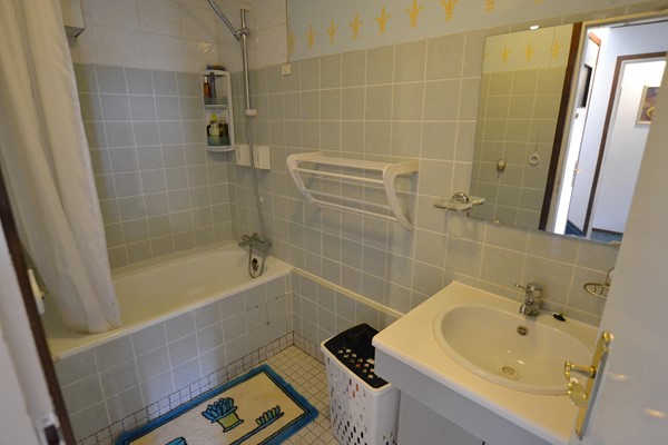 Badkamer 2,75 x 1,35 met mozaïekvloer, ligbad/douche en badkamermeubel met wastafel.