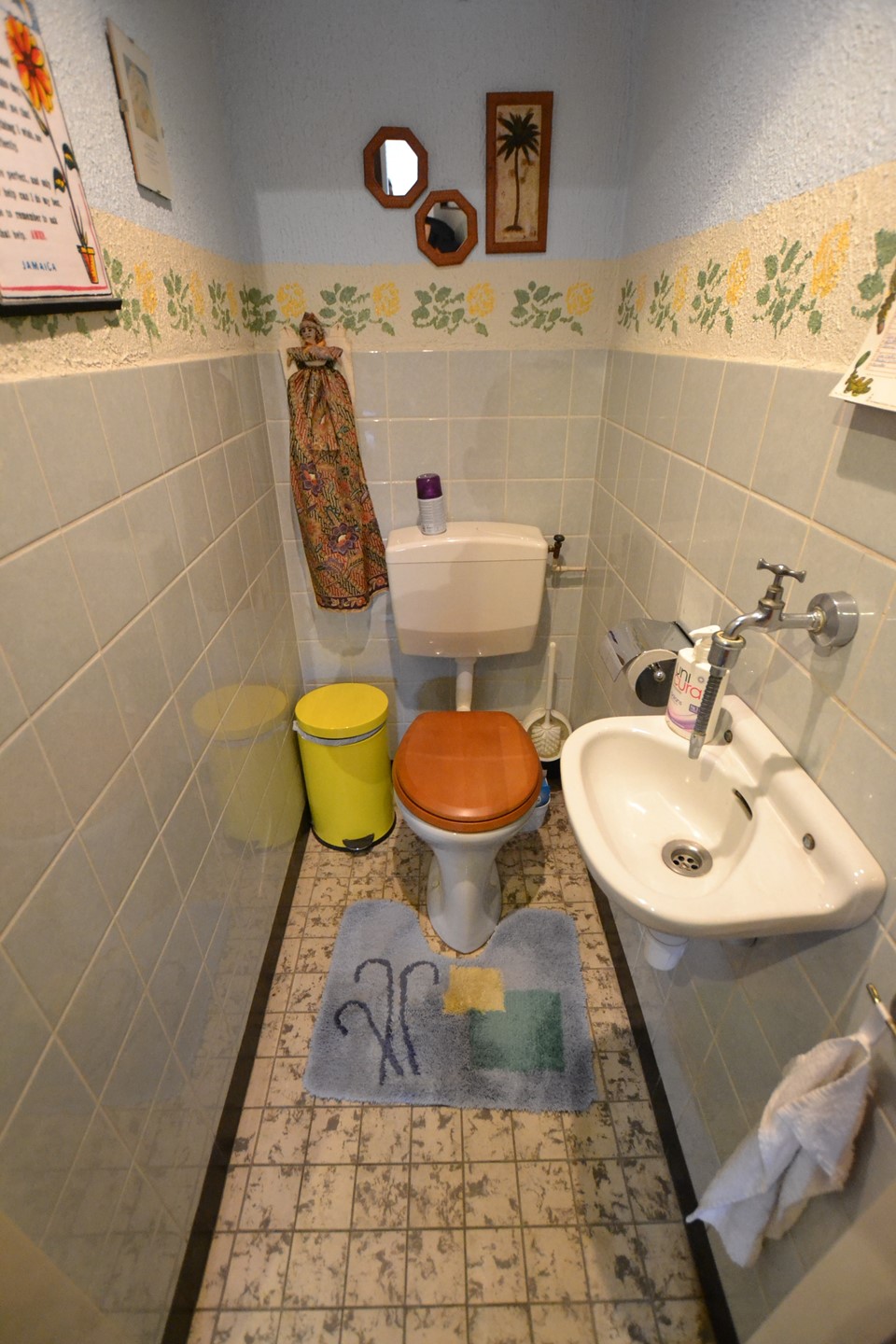 Toiletruimte 1,45 x 0,85 met plavuizenvloer, inbouwspot, duoblok en fonteintje.