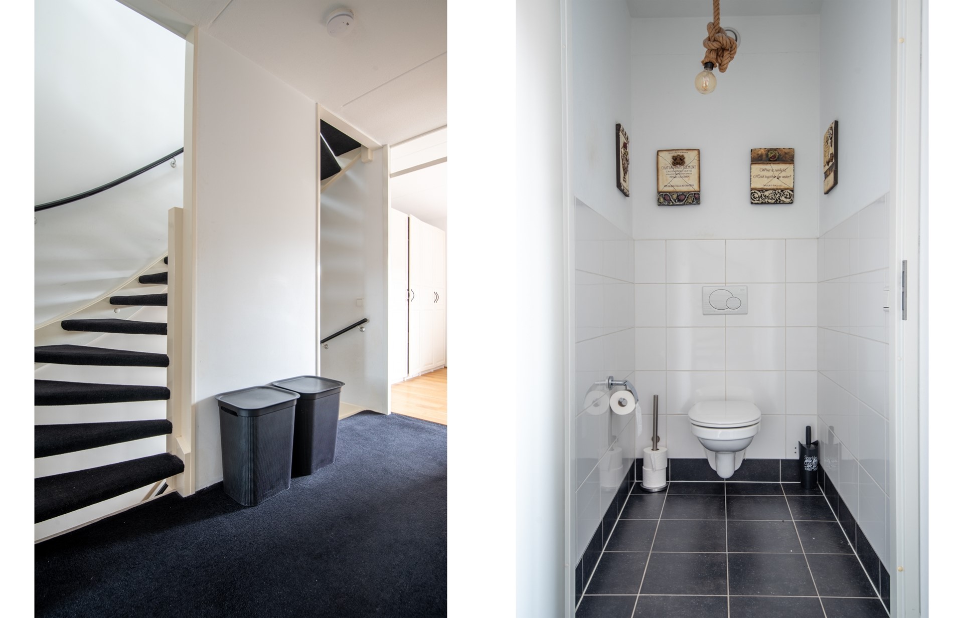 Je komt binnen via de entree met toegang tot de meterkast en het toilet. Vanuit de hal stap je in de eetkamer, die direct in verbinding staat met de keuken aan de voorzijde. Achterin vind je de lichte woonkamer met schuifdeuren naar de tuin. Daarnaast zijn er handige kasten onder de trap voor extra bergruimte.