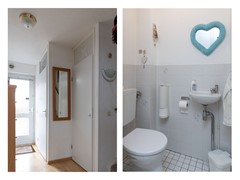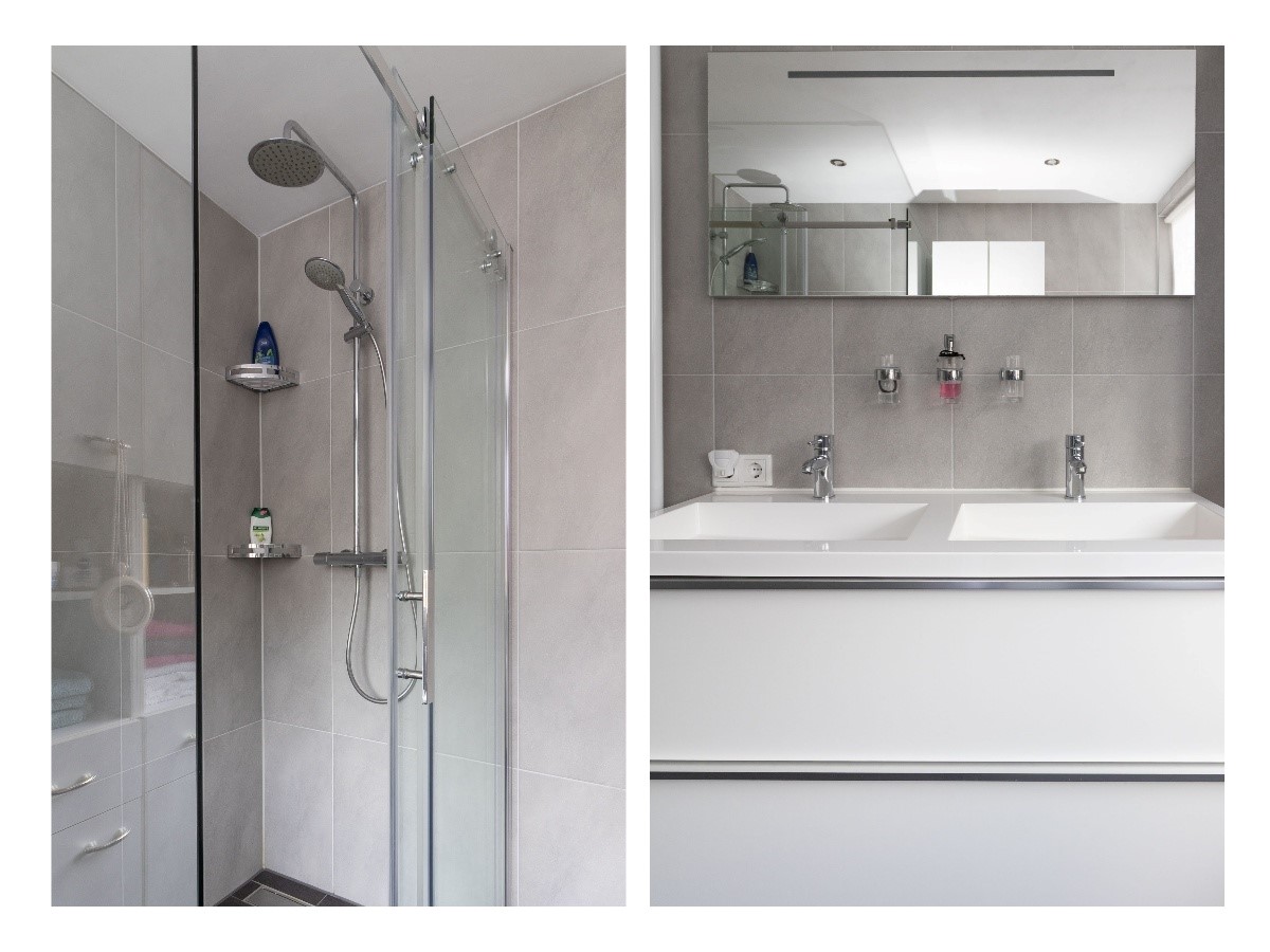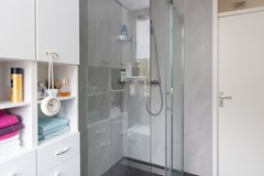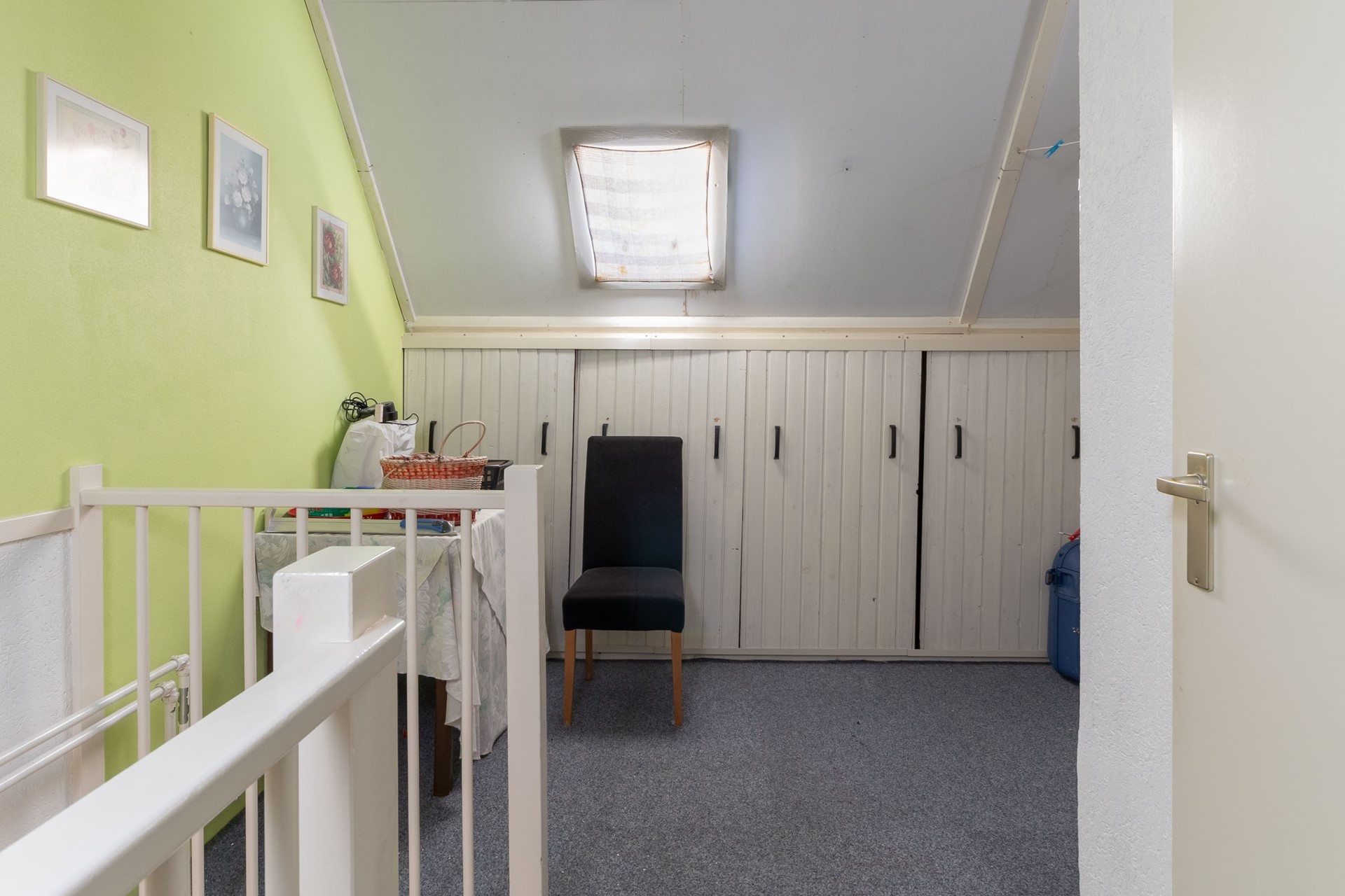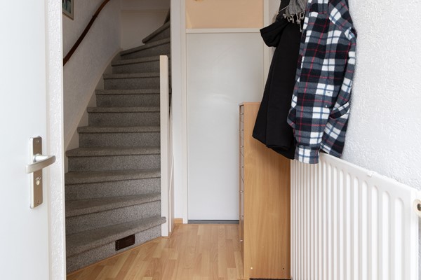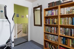 Overloop met opstelling voor de wasapparatuur en toegang tot een vierde slaapkamer. De verdieping beschikt over praktische bergruimte achter knieschotten, wat zorgt voor extra opslag. De trap verbindt deze verdieping met de eerste verdieping.