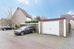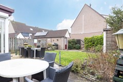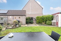De achtertuin is gelegen op het westen en biedt volop zon in de middag en avond. De tuin is ingericht met een ruim terras, gazon en groene borders. Achterin bevindt zich een stenen berging, ideaal voor fietsen en tuingereedschap. Aan de andere zijde is een stenen garage gesitueerd. De tuin is omsloten en beschikt over een praktische achterom.