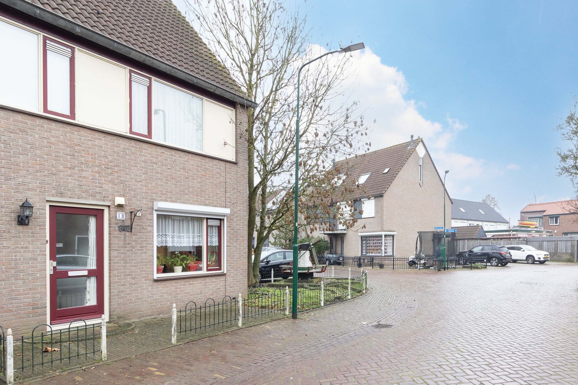 Aan de voorzijde beschikt de woning over een ruime voortuin, gelegen aan een rustige straat. De tuin is aangelegd met groen en lage erfafscheiding, wat zorgt voor een open en vriendelijke uitstraling. Dankzij de hoekligging is er extra ruimte en licht rondom de woning.
