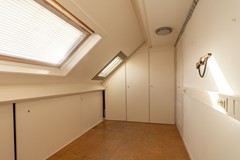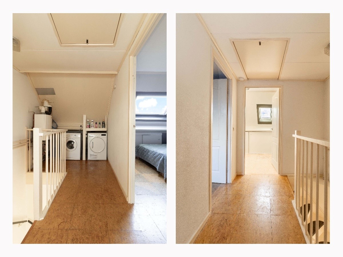 Overloop met opstelling voor de wasapparatuur en de cv-installatie. Vanuit de overloop toegang tot twee slaapkamers, beide voorzien van daglicht. Daarnaast is er praktische bergruimte aanwezig achter de knieschotten, wat zorgt voor extra opslagruimte.