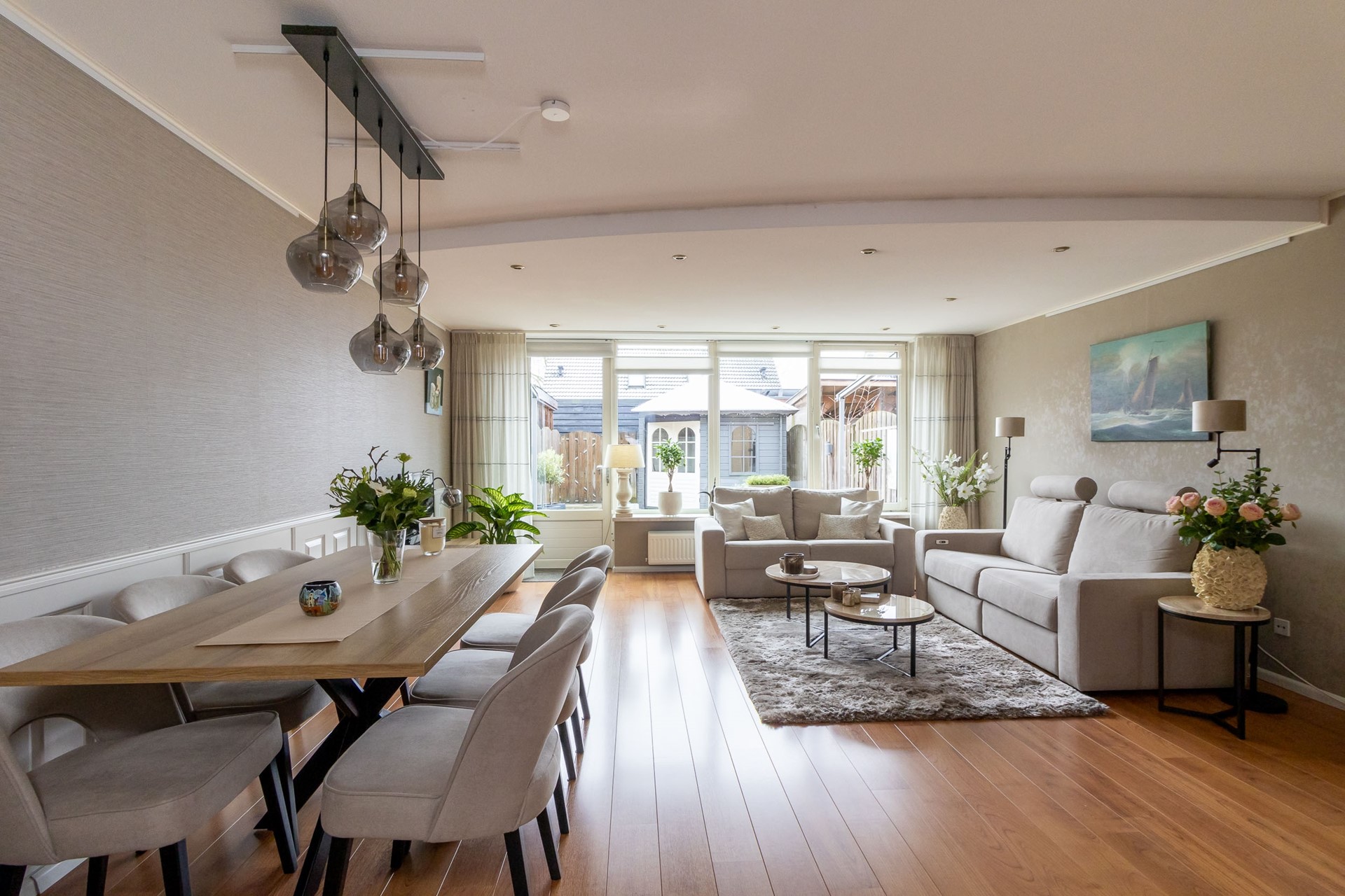 Vanuit de hal betreed je de royale woonkamer, die zich uitstrekt over de volledige diepte van de woning. Dankzij de grote raampartijen aan de achterzijde geniet deze ruimte van veel daglicht en een prettige verbinding met de tuin. De woonkamer biedt volop ruimte voor een comfortabele zit- en eethoek.