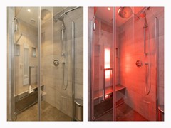 De badkamer is praktisch ingedeeld en voorzien van een (infrarood)douche, wastafel en toilet.