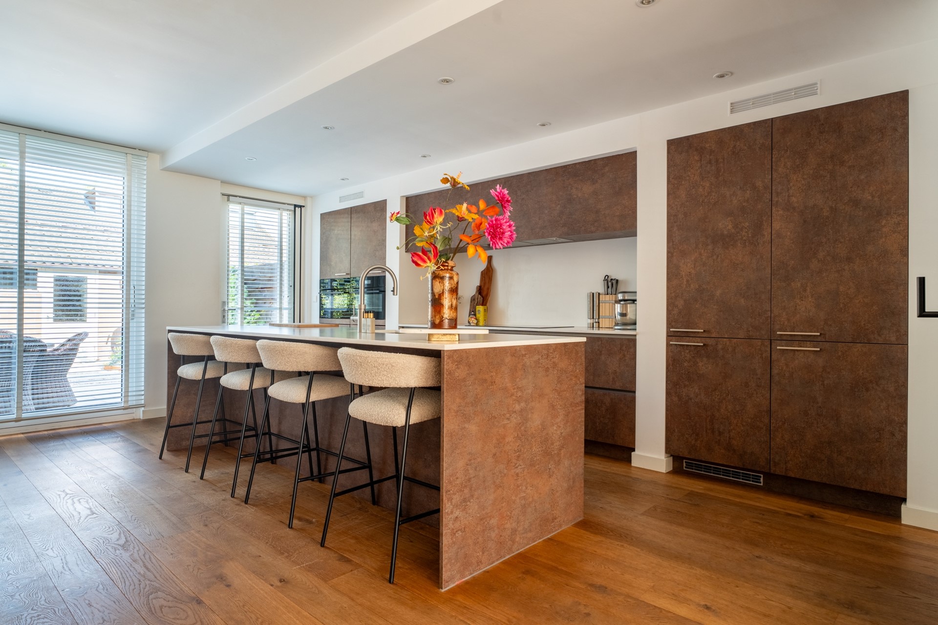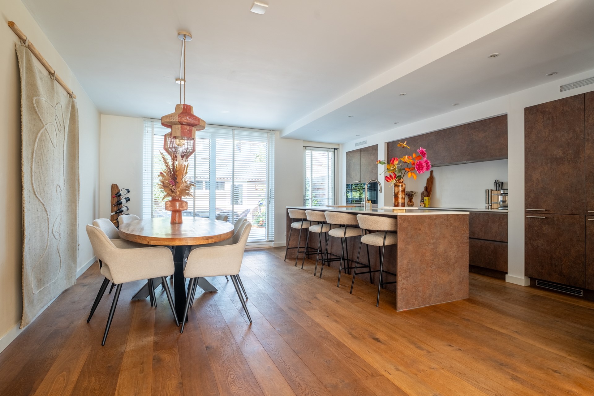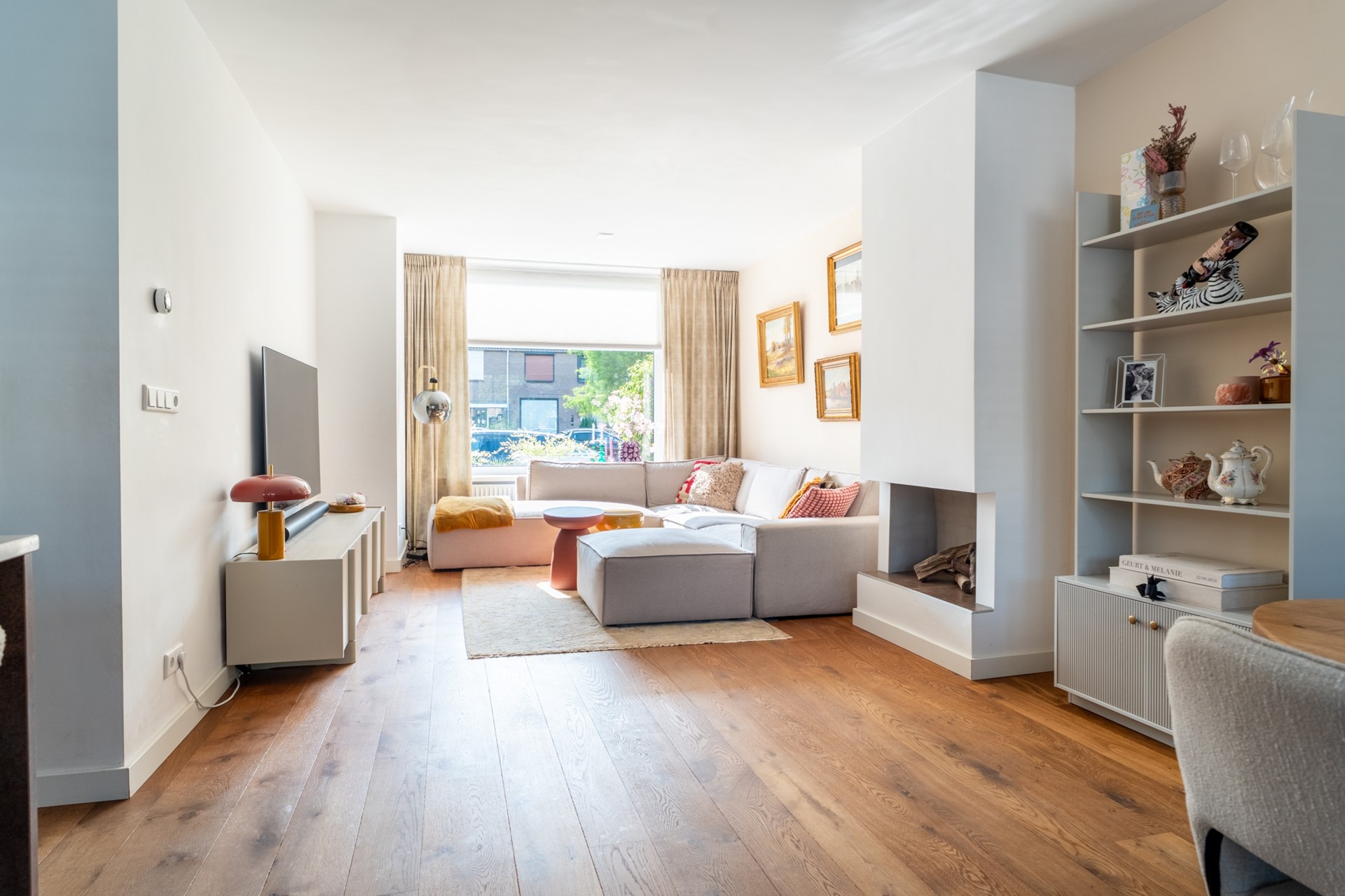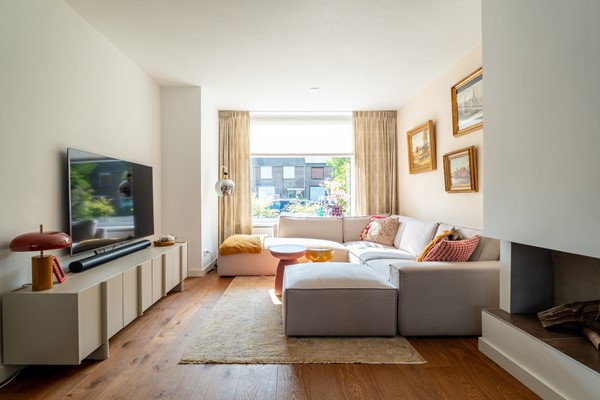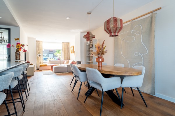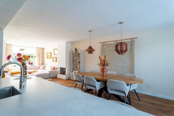 Door de royale breedte voelt het huis opvallend ruim en open aan. Bovendien is de indeling flink geoptimaliseerd. Op de begane grond vind je een lichte en praktische woonkamer met sfeervolle haard, ideaal voor gezellige avonden. De keuken vormt het hart van de woning, uitgevoerd met een modern kookeiland en volop ruimte voor een grote eettafel. Een plek waar koken, samenzijn en genieten naadloos samenkomen.