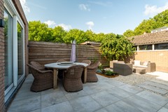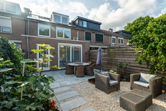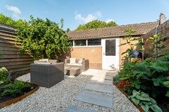 De tuin is modern en onderhoudsvriendelijk aangelegd met een combinatie van grote terrastegels en grindvlakken, afgewisseld met groene borders en sfeervolle beplanting. Direct achter de woning bevindt zich een ruim terras, ideaal voor een eettafel. Achterin de tuin is een tweede zitgedeelte gecreëerd met een gezellige loungehoek, omgeven door groen. De tuin is volledig omsloten door houten schuttingen en beschikt over een achterom en een praktische stenen berging.