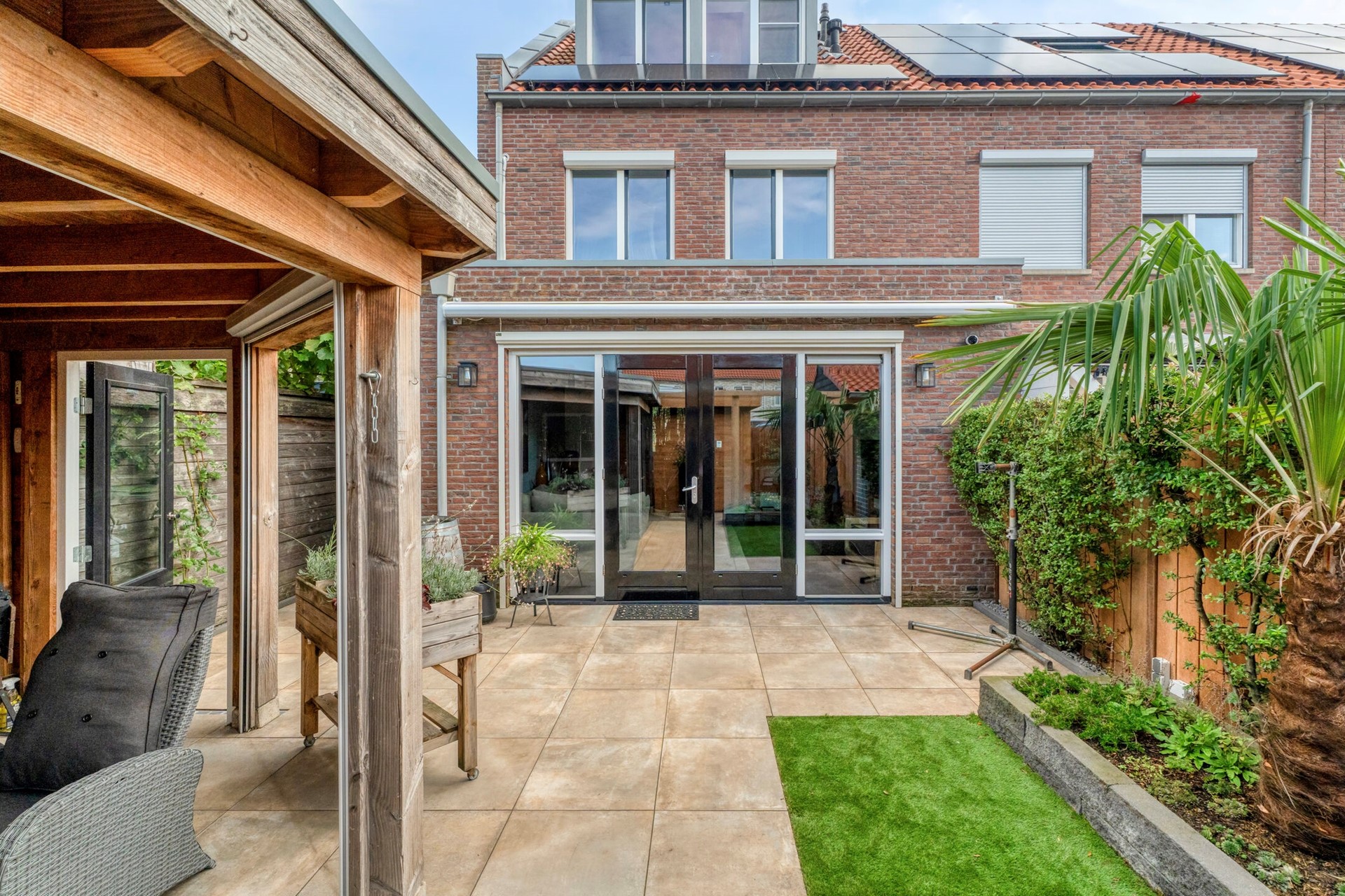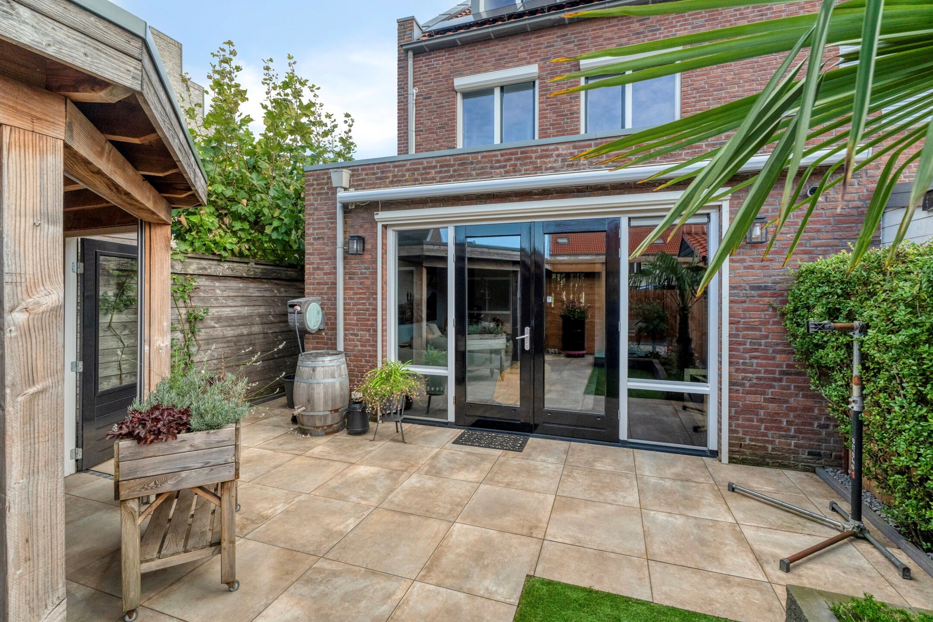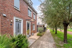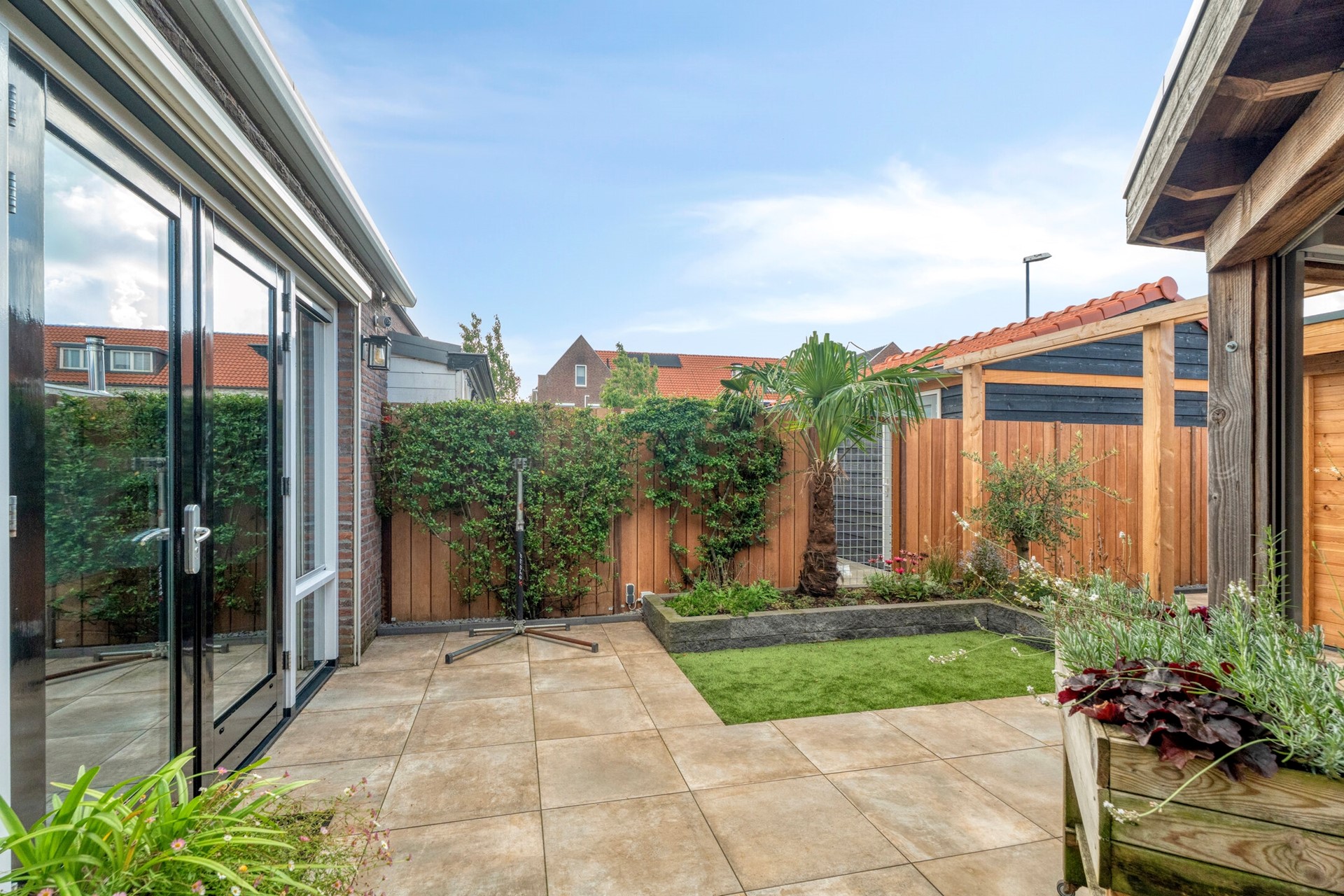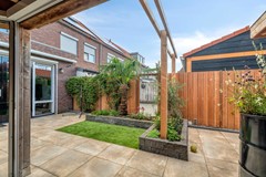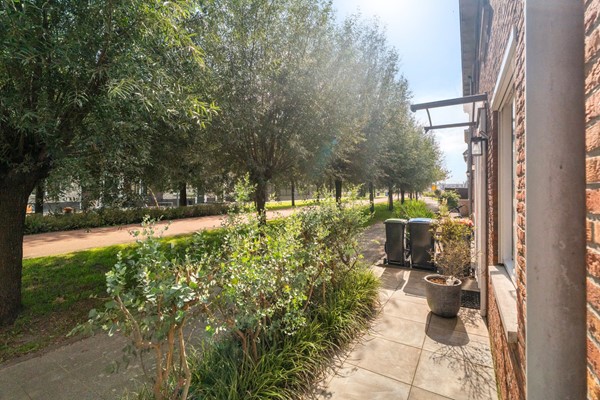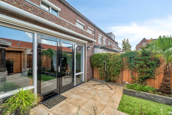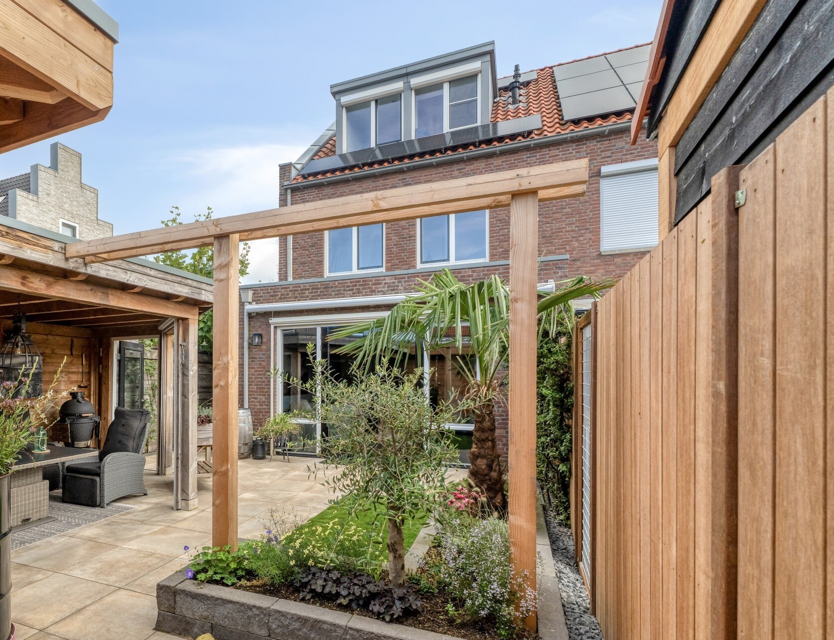 De woning beschikt over een fraai aangelegde achtertuin, die is ingericht met een combinatie van sierbestrating, groenperken en kunstgras. Dankzij de strakke betegeling is de tuin onderhoudsvriendelijk en biedt deze volop ruimte voor een zithoek, speelruimte en extra beplanting. De aanwezigheid van diverse groenaccenten, een palm en olijfboom geven de tuin een speels en sfeervol karakter.