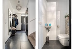 Bij binnenkomst via de voordeur komt u in de entree met voldoende ruimte voor een kapstok of garderobe. Vanuit de entree heeft u toegang tot de meterkast (MK), het toilet met fonteintje, en de trapopgang naar de verdieping. Daarnaast is er onder de trap een praktische trapkast aanwezig, ideaal als berging.