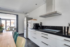 Aan de voorzijde van de woning bevindt zich de keuken. Deze is ruim opgezet en beschikt over een recht keukenblok met inbouwapparatuur en aansluitmogelijkheden voor alle gewenste voorzieningen. Dankzij de ligging aan de straatzijde heeft u hier prettig uitzicht en veel lichtinval. Daarnaast beschikt de keuken over een airco.