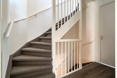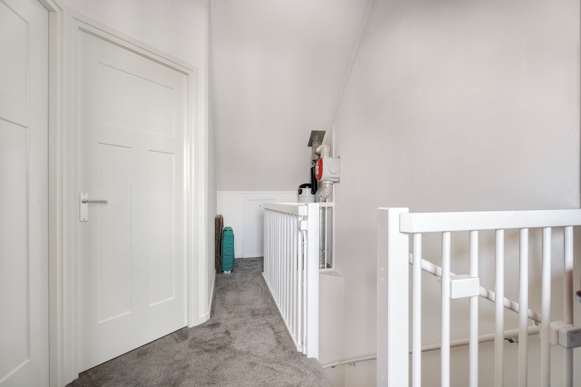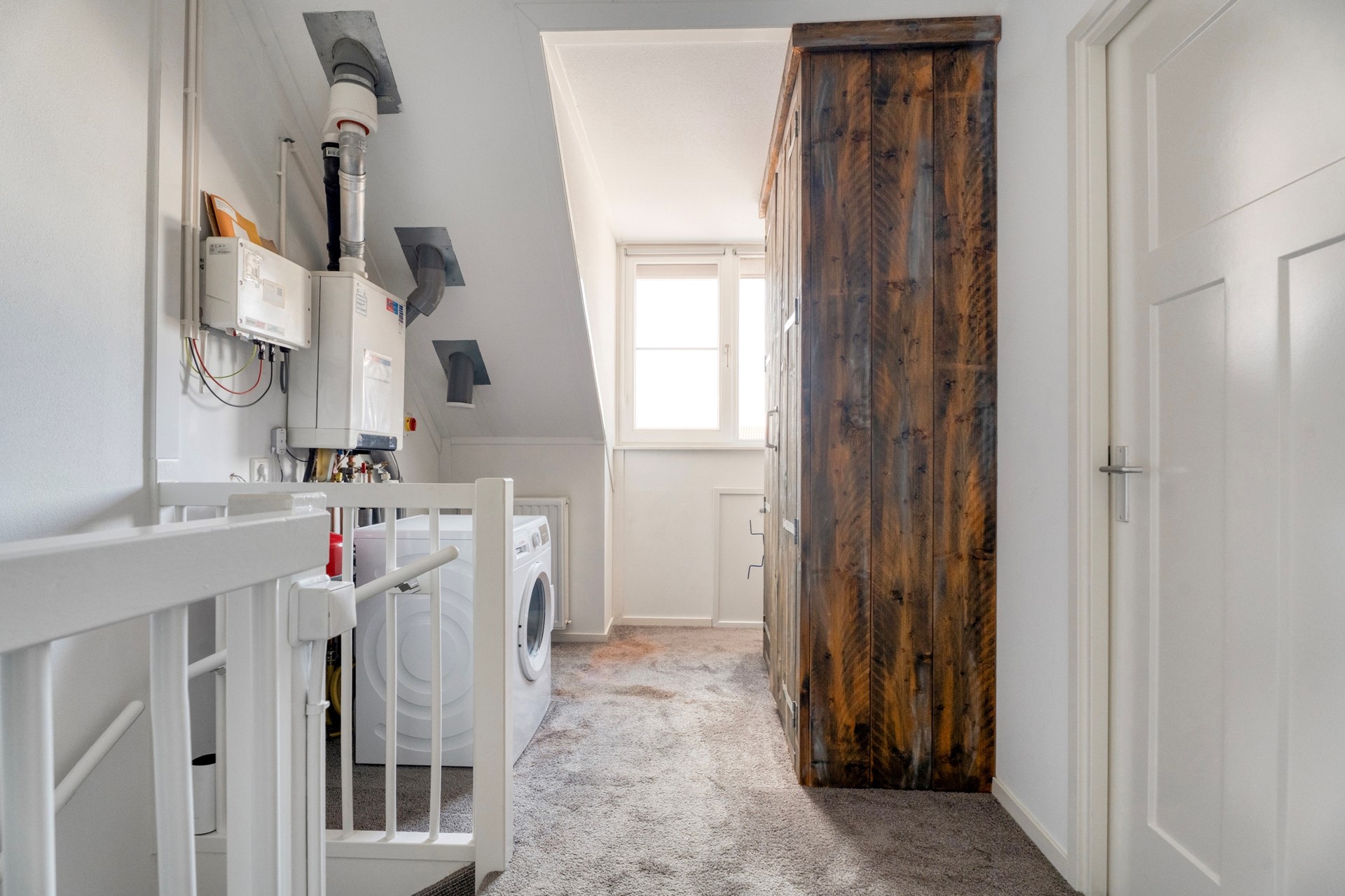 Via de vaste trap bereikt u de tweede verdieping. De overloop biedt ruimte voor de wasmachine- en drogeraansluiting en geeft toegang tot de aanwezige vertrekken.