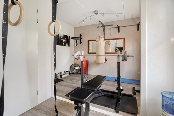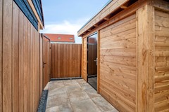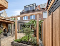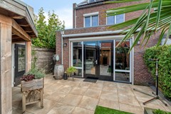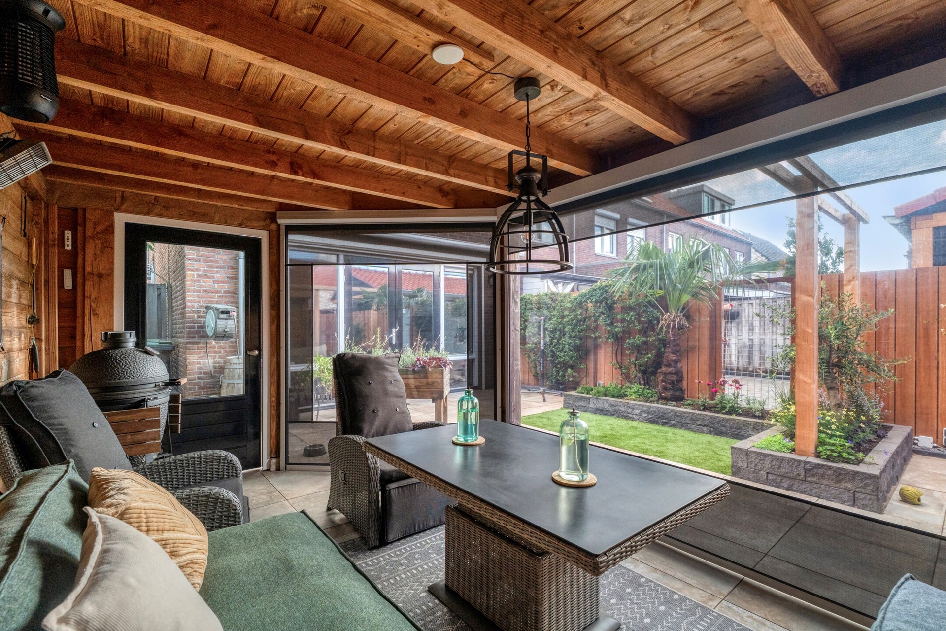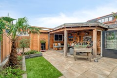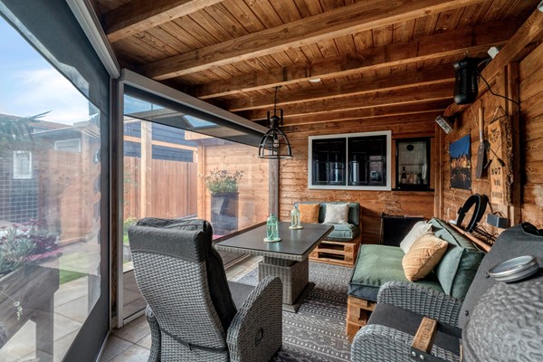 Achter in de tuin staat een royale overkapping met berging. Deze sfeervolle veranda is voorzien van een zitgedeelte en biedt de ideale plek om het hele jaar door te genieten van het buitenleven. Het overdekte terras is perfect geschikt voor gezellige avonden met vrienden of familie, en biedt tevens praktische ruimte voor een barbecue of buitenkeuken.