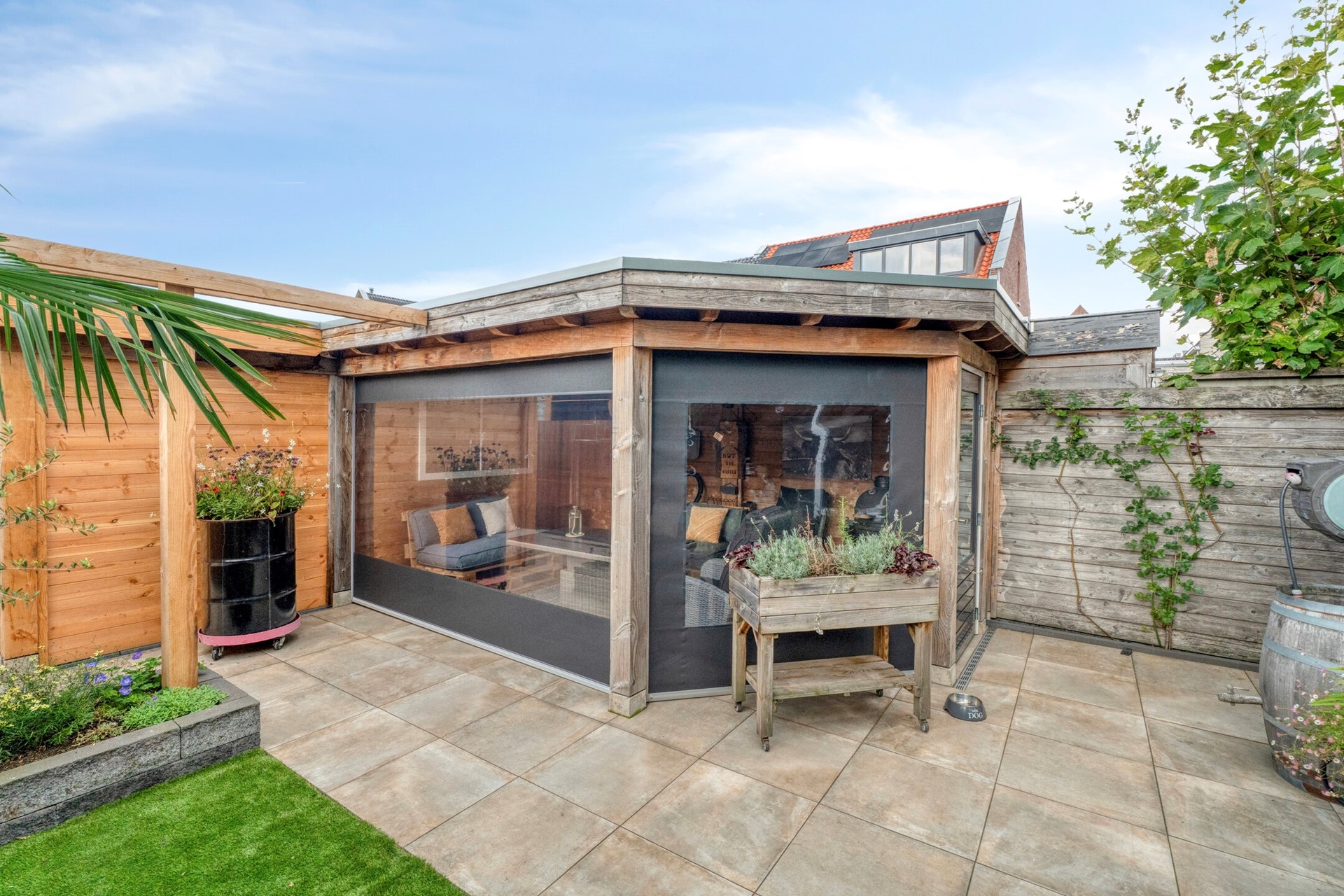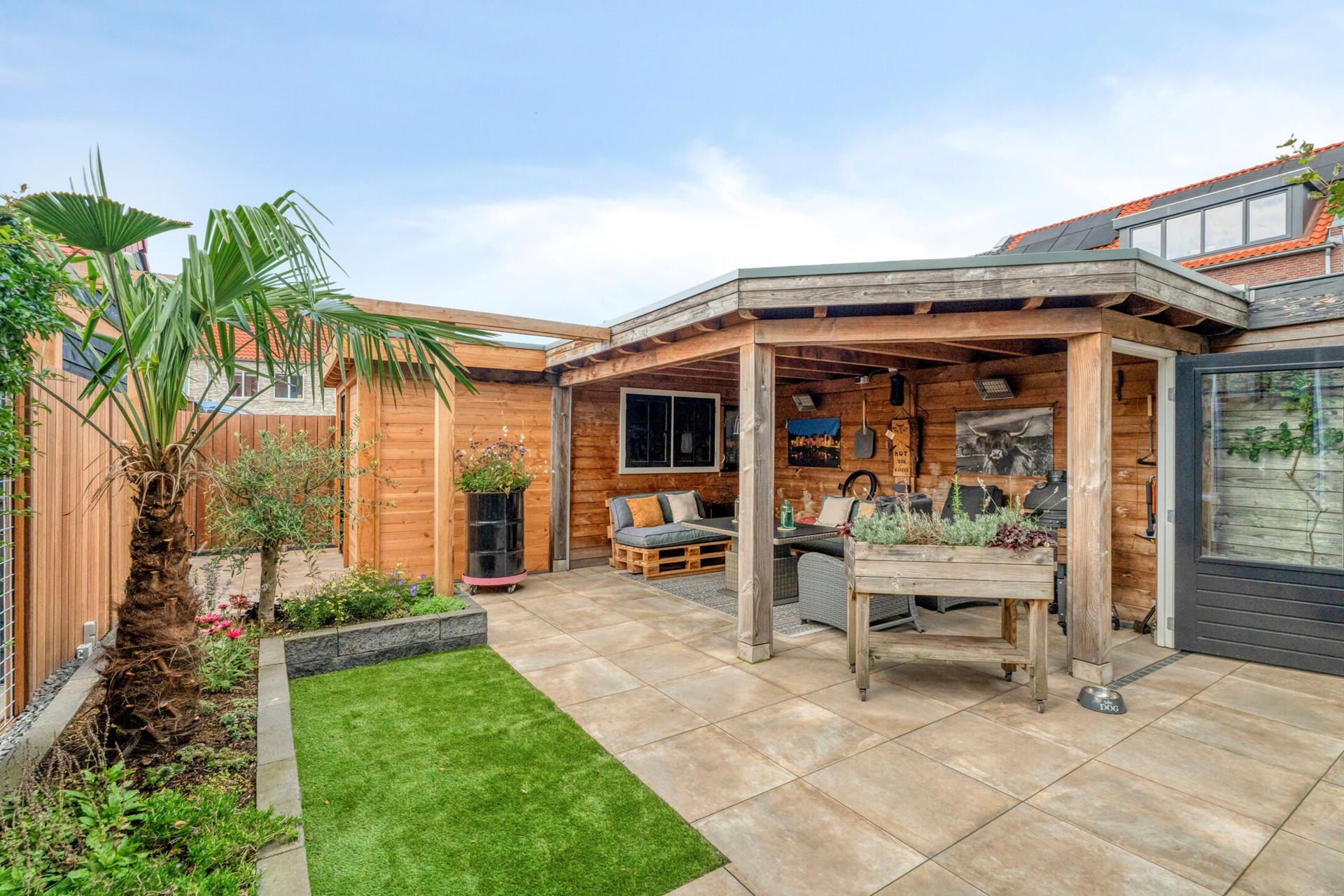 Buiten begint het genieten al. De tuin ligt perfect op het westen, waardoor je hier tot in de avond zon hebt. Onder de moderne veranda met elektrische schermen is het in elk seizoen een fijne plek om te ontspannen, terwijl de vergrote schuur zorgt voor volop praktische bergruimte.