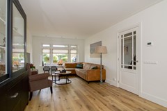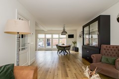 De hal biedt doorgang naar de ruime woonkamer, die zich aan de voorzijde van de woning bevindt. Dankzij de brede raampartij is hier veel natuurlijke lichtinval, wat zorgt voor een aangename, lichte leefruimte. De woonkamer loopt naadloos over in de open keuken aan de achterzijde van de woning.