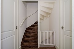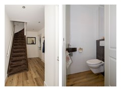 Via de voordeur betreed je de hal, waar zich de meterkast , het toilet met fontein en de trapopgang naar de eerste verdieping bevinden. Vanuit de hal is er tevens toegang tot een praktische voorraadkast.