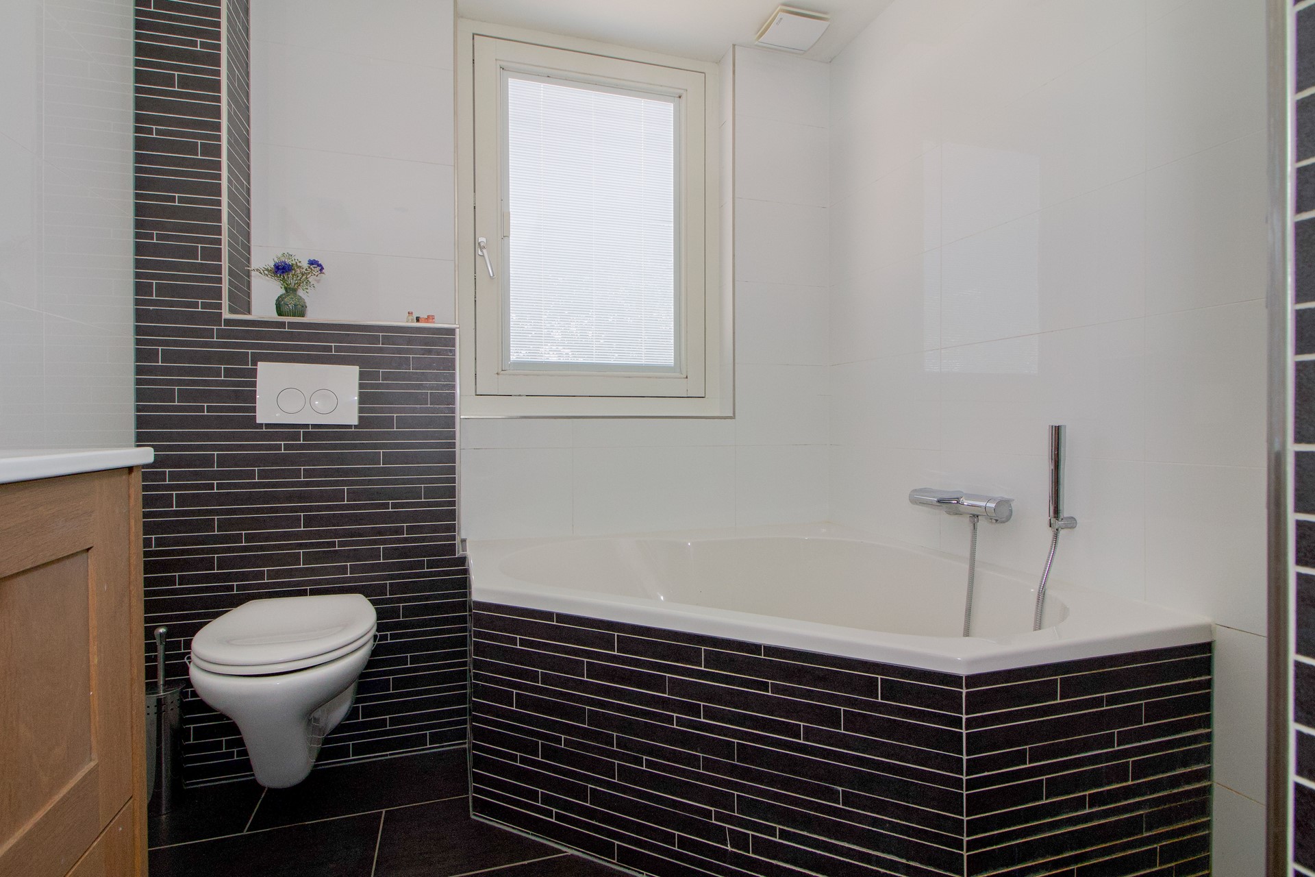 De badkamer is praktisch ingedeeld en voorzien van een ligbad, een wastafelmeubel en een tweede toilet. Dankzij het raam kan de ruimte goed worden geventileerd en profiteer je van prettig daglicht.