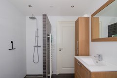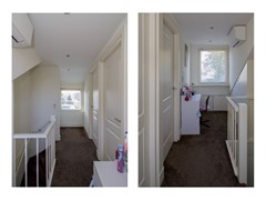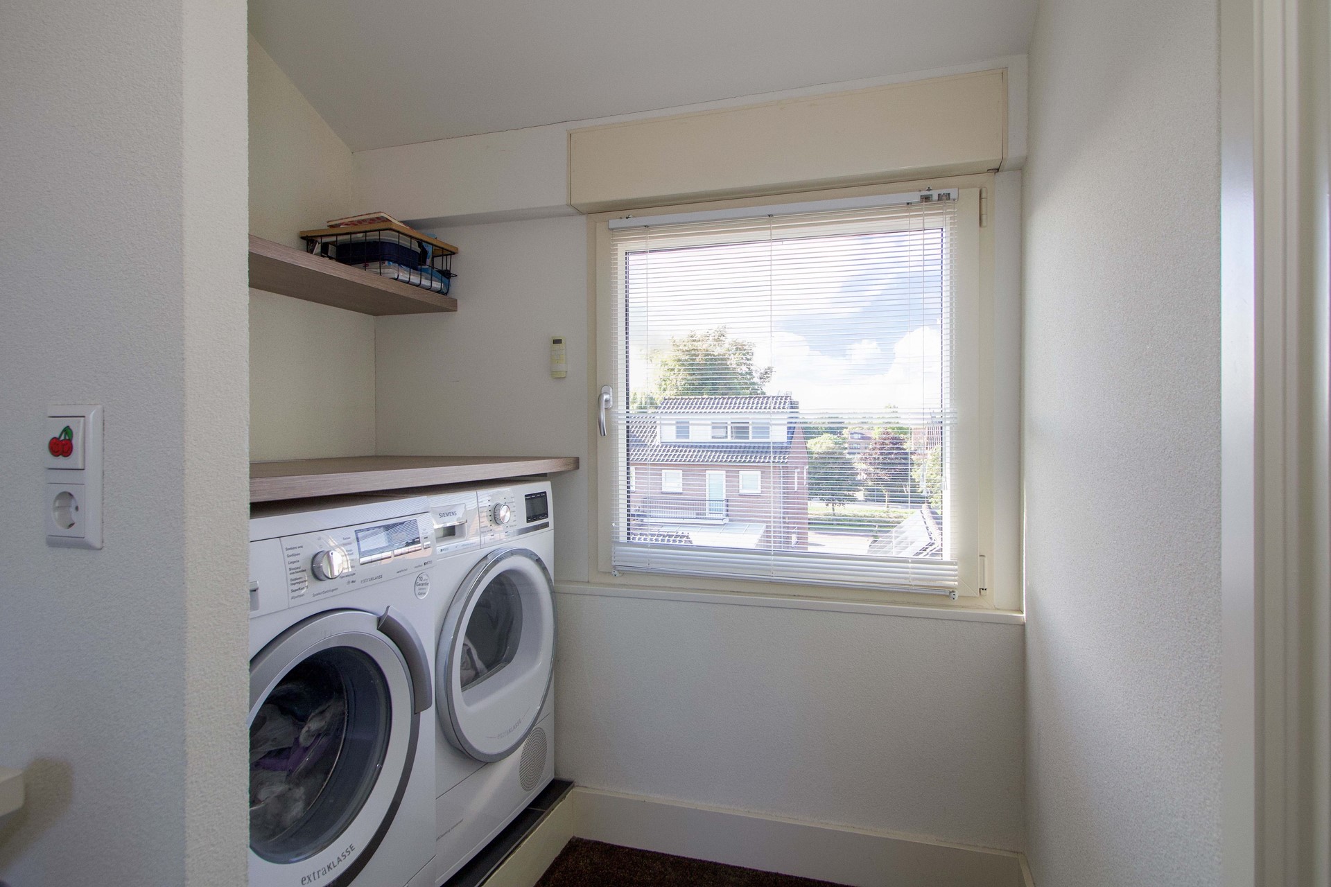 Op de overloop bevindt zich tevens de aansluiting voor de wasmachine en droger, evenals de cv-installatie. De ruimte is efficiënt ingedeeld en biedt extra mogelijkheden voor opbergruimte achter knieschotten of kasten.