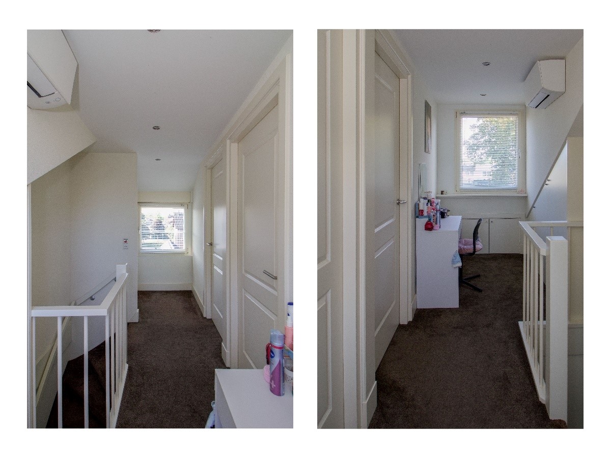 Via een vaste trap kom je op de tweede verdieping, waar de overloop toegang biedt tot twee kamers.