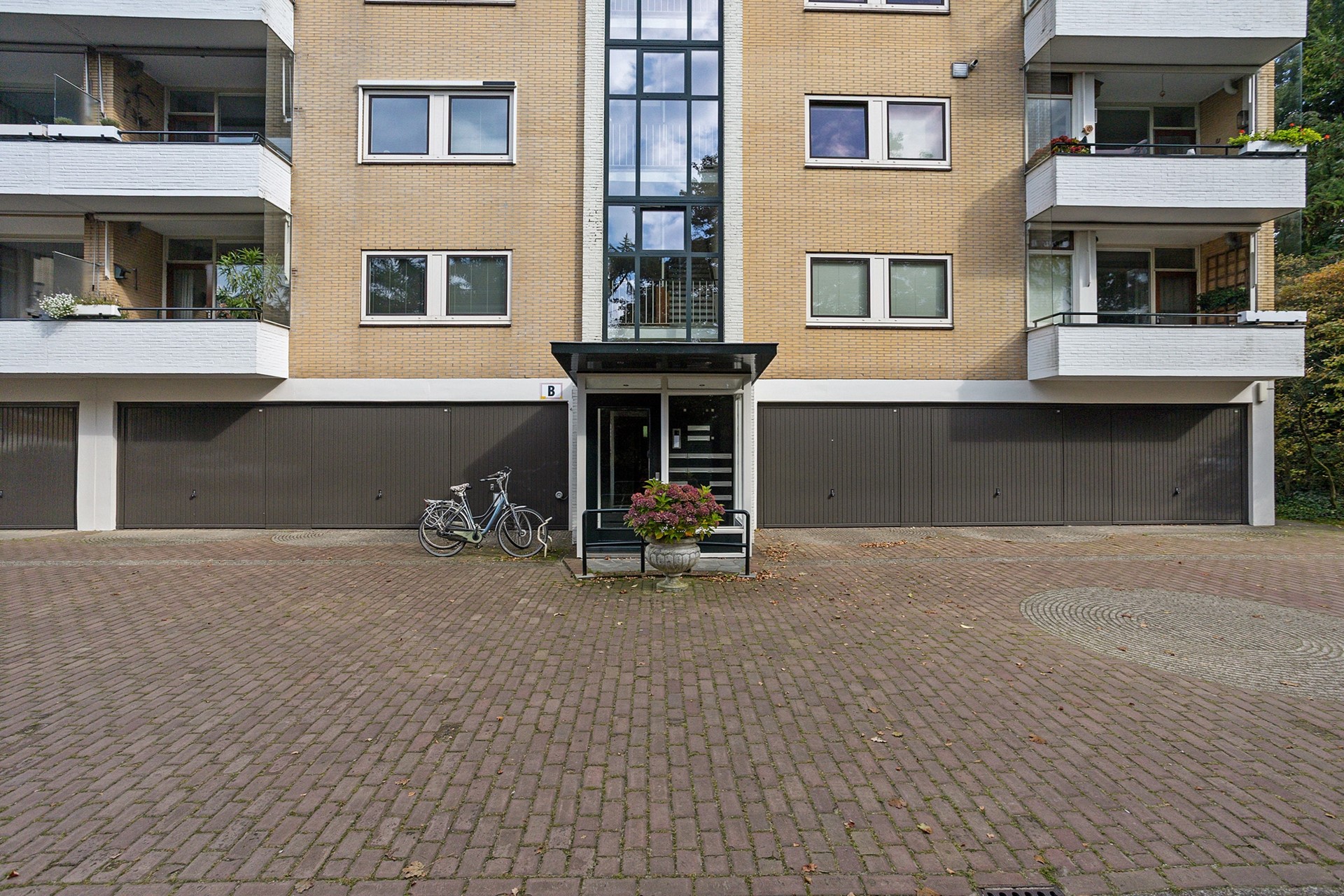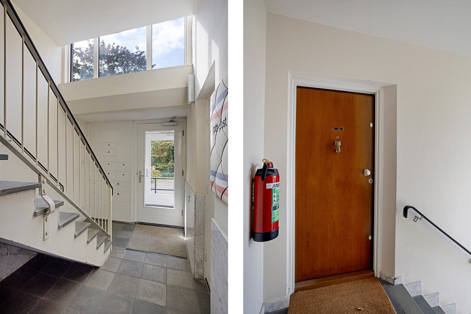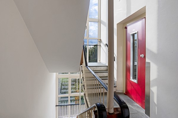 Afgesloten entree met brievenbussen, trapopgang, liftinstallatie en toegang tot de bergingen in de onderbouw.