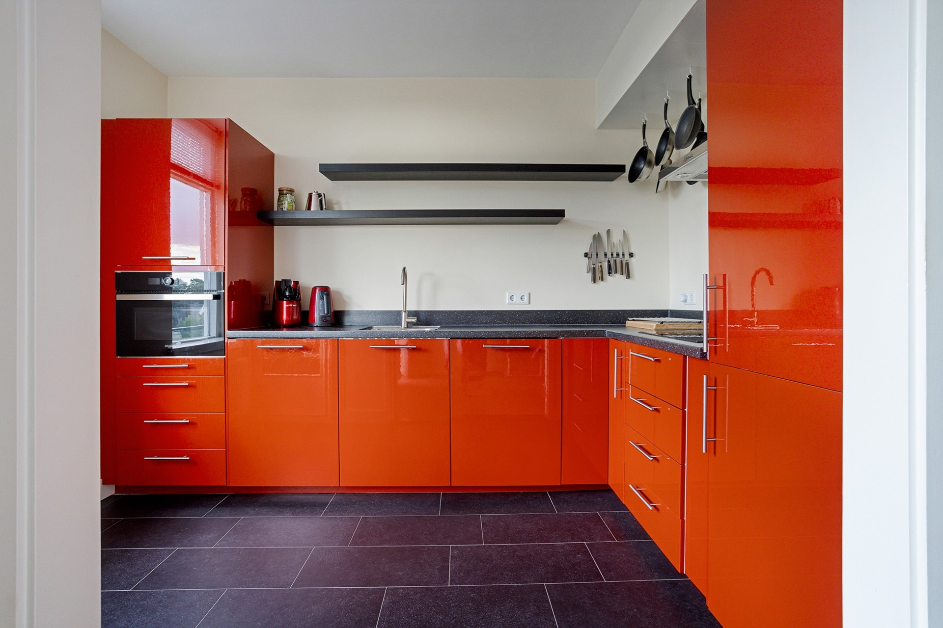 Vanuit de hal toegang tot een slaapkamer, een moderne keuken met inbouwapparatuur en deur naar het zeer zonnige, ruime balkon op het westen.
